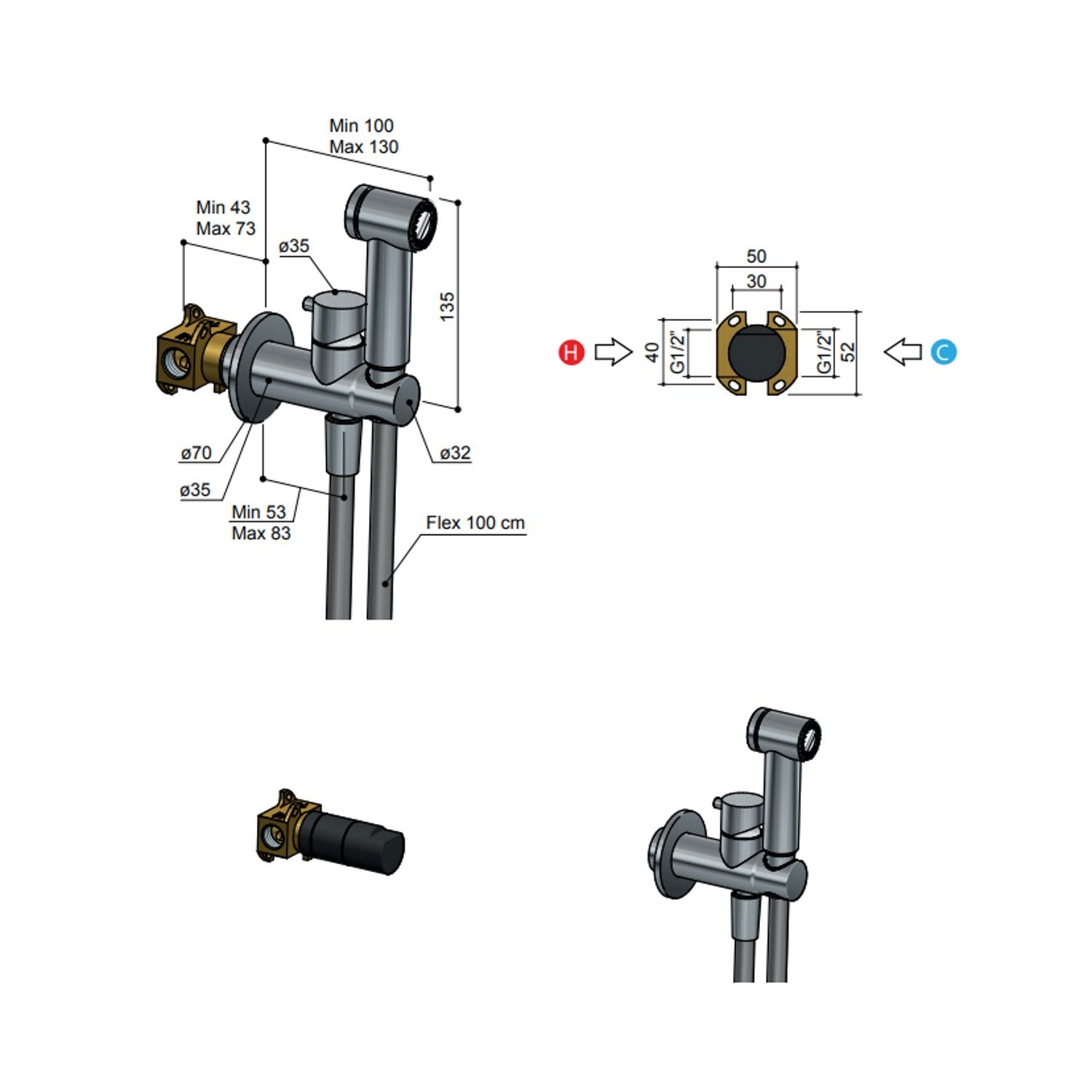 De kraan is 13.5 cm hoog en het breedste deel, de rozet, heeft een doorsnede van 7 cm. De diepte is aan te passen maar het is minimaal tien cm diep. De bidetkraan zelf is 13.5 cm lang.