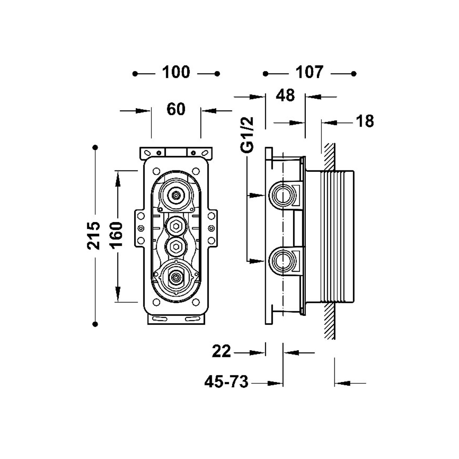 De hoogte van de inbouwbox is 21,5 cm en de breedte is 10 cm. De thermostaat heeft een diepte van 10,7 cm.