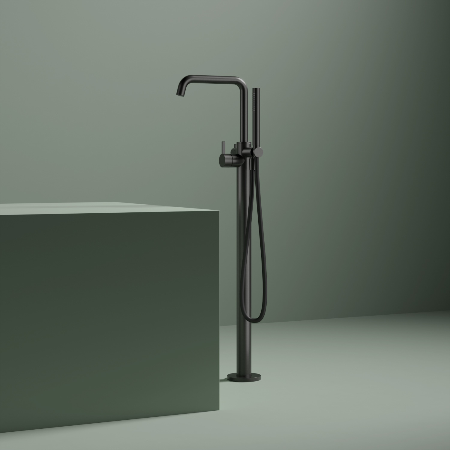 Beleef een heerlijke ervaring in uw badkamer en geniet! De Ace badmengkraan van het merk Hotbath Deze vrijstaande baduitloop zorgt voor een strakke afwerking en een moderne look in uw badkamer. De kraan is geschikt voor vrijstaande baden en zorgt voor een luxe uiterlijk. De hoogte van de kraan is 97 cm. De hoogte van de uitloop is 90 cm. En dat volledig van geborsteld Zwart PVD . Dankzij de PVD coating heeft de kraan een blijvende mooie kleur. De coating zorgt ook voor een perfecte glans, slijtvastheid en uitmuntende krasbestendigheid