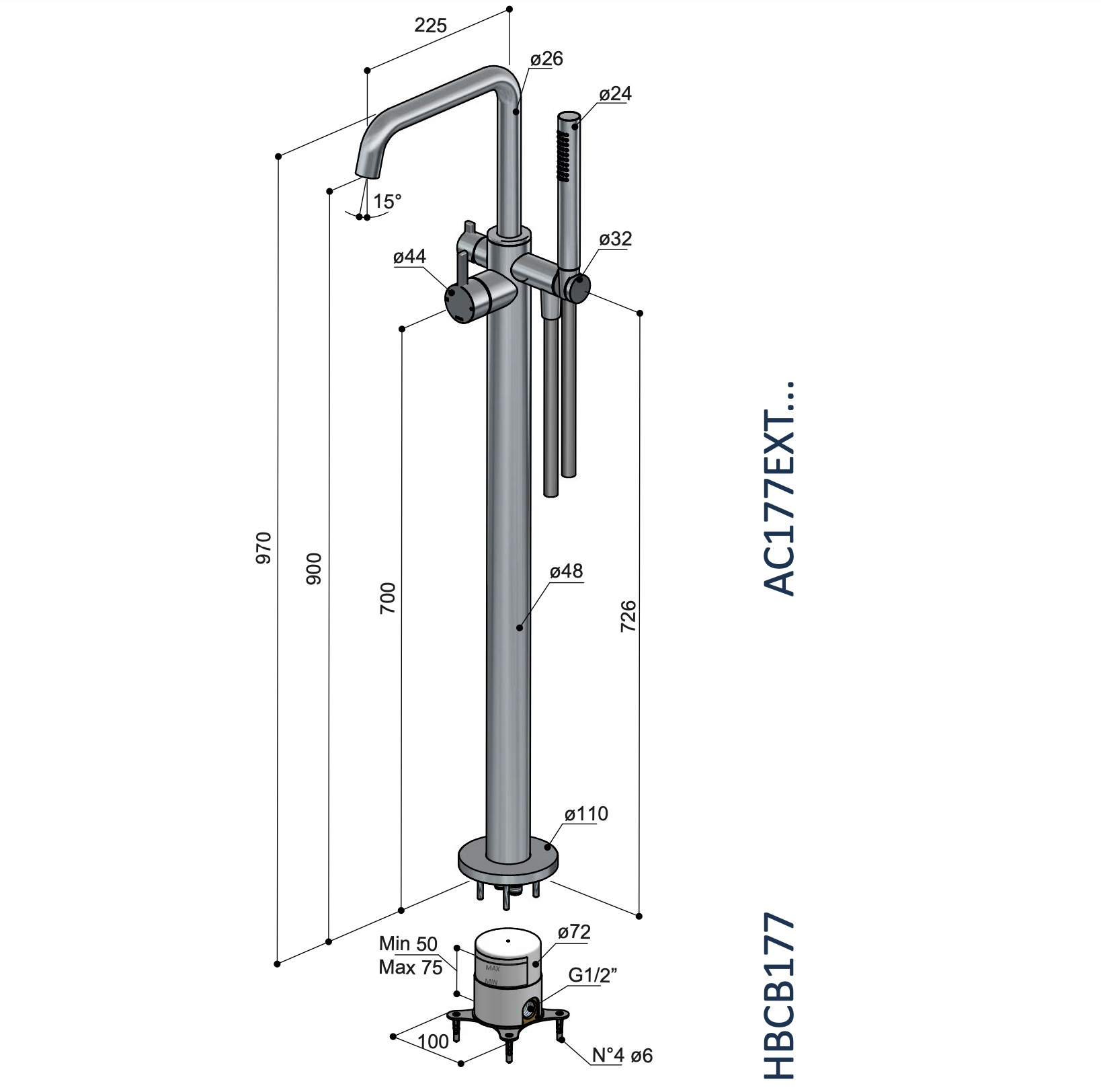 Beleef een heerlijke ervaring in uw badkamer en geniet! De Ace badmengkraan van het merk Hotbath Deze vrijstaande baduitloop zorgt voor een strakke afwerking en een moderne look in uw badkamer. De kraan is geschikt voor vrijstaande baden en zorgt voor een luxe uiterlijk. De hoogte van de kraan is 97 cm. De hoogte van de uitloop is 90 cm. En dat volledig van chroom.