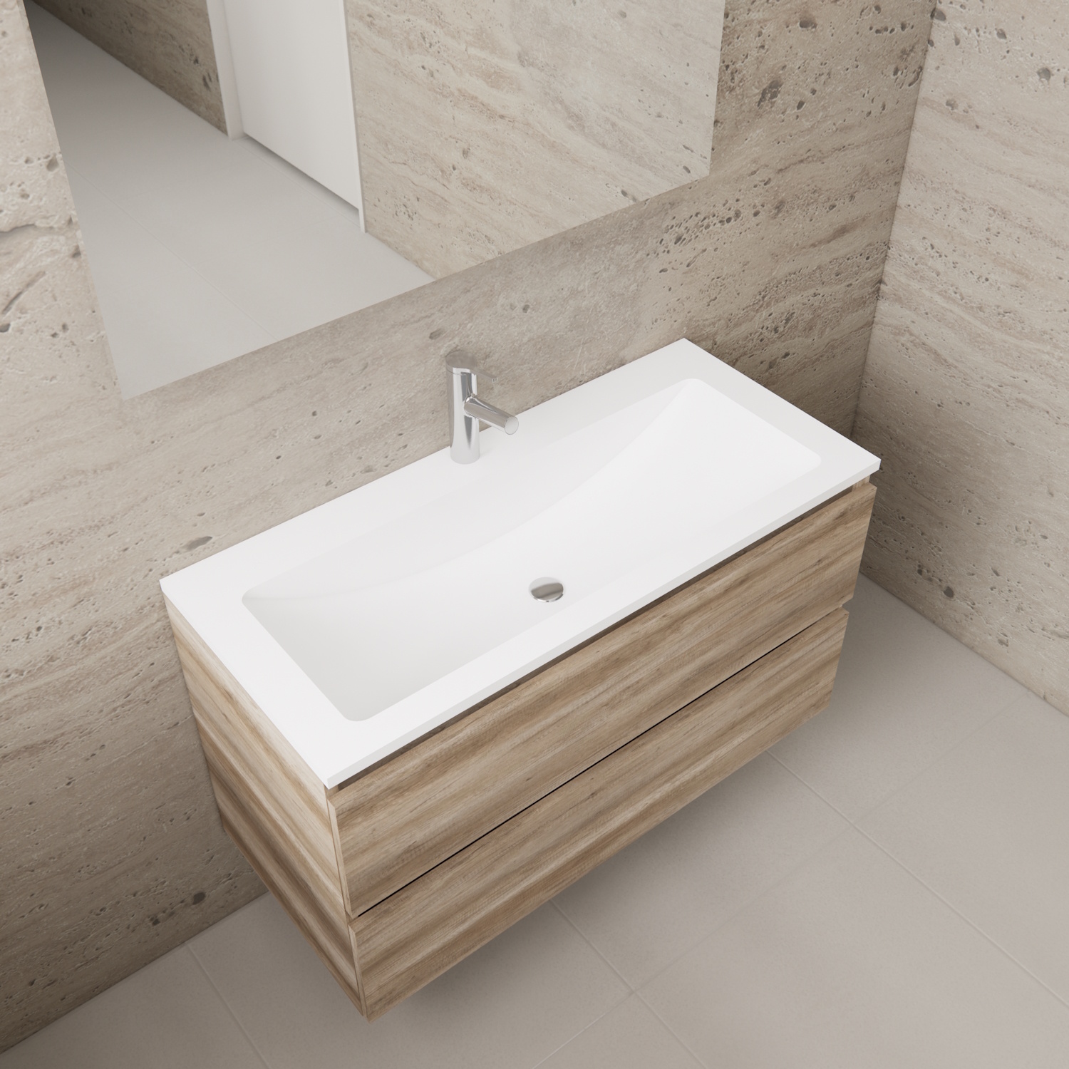 De wastafel is gemaakt van cast marble. Met een afmeting van 98.9 x 50 centimeter heeft u genoeg ruimte voor het gezin om al u toiletartikelen of handdoeken op te bergen. Cast marble wastafels zijn in alle opzichten perfect. Gegoten marmer is een tijdloos materiaal dat, in tegenstelling tot keramische materialen, een grote verscheidenheid aan vormen toelaat. Dit maakt het mogelijk om vormen te maken die ondenkbaar zouden zijn met gewone keramiek. De gegoten wastafels profiteren daarom van perfect schone randen en perfect vlakke schapruimte. De uiteindelijke oppervlakteafwerking bestaat uit een laag geverfde hars (gelcoat) die het gietmarmer beschermt tegen krassen en tegen veelgebruikte cosmetische en hygiëneproducten. De levering van de wastafel is inclusief een overloopdop).