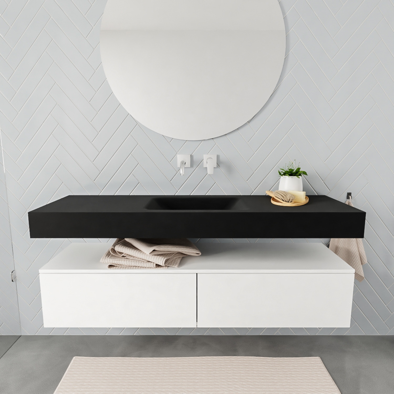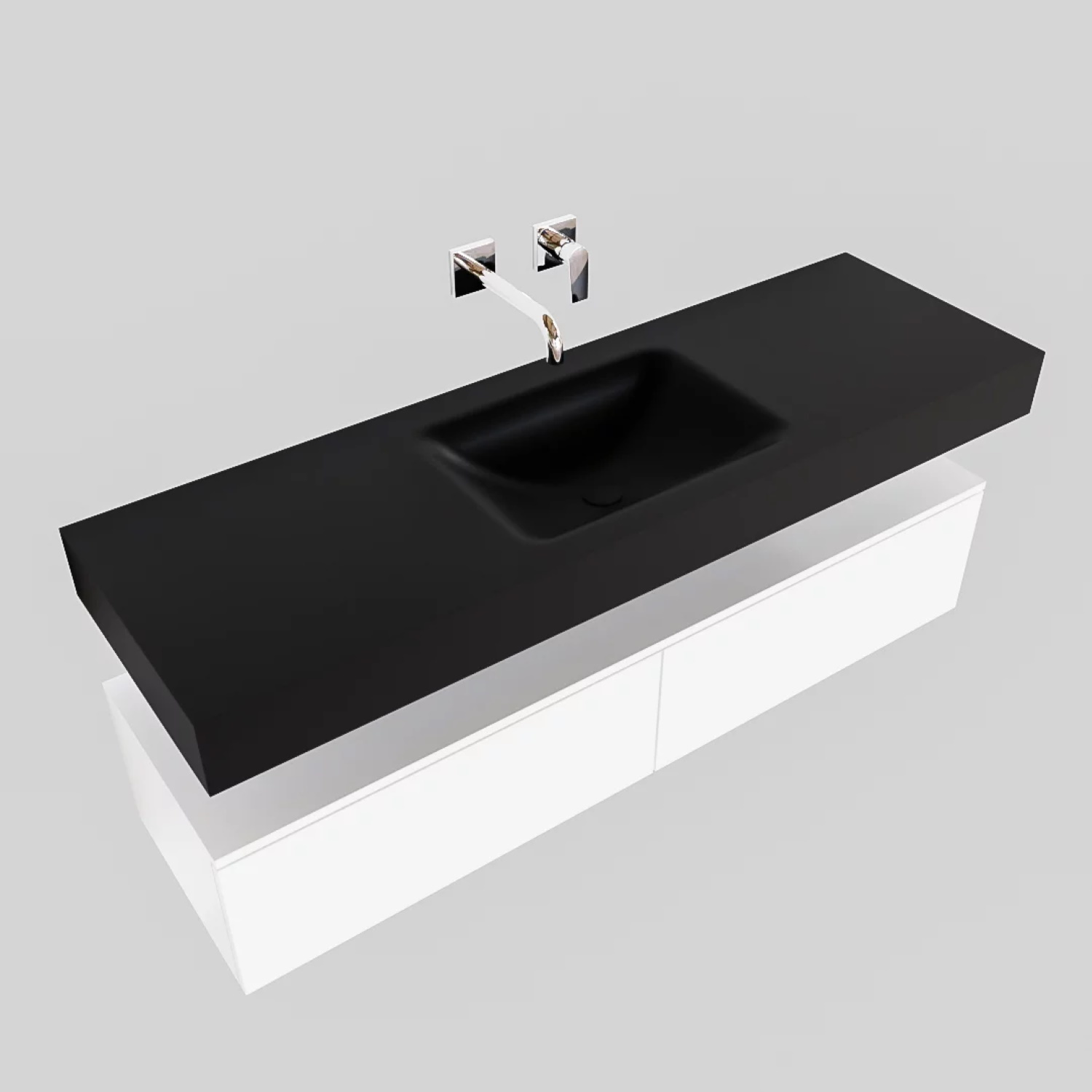De bijpassende onderkast heeft een afwerking in de kleur mat wit, terwijl de wastafel een mat zwarte kleur heeft. De onderkast beschikt over twee soft-close lades waarin u diverse badkamerartikelen kunt bewaren. Het betreffen lades die greeploos zijn waardoor deze onderkast een zeer strak en modern design heeft. Dit badmeubel is leverbaar in acht verschillende varianten. U kunt ervoor kiezen om de spoelbak links, in het midden of aan de rechterkant van het meubel te hebben. Ook is deze wastafel leverbaar in een variant met twee spoelbakken. De wastafel is uitgerust zonder of met kraangat, terwijl u bij de dubbele wastafel de keuze heeft uit nul of twee kraangaten.