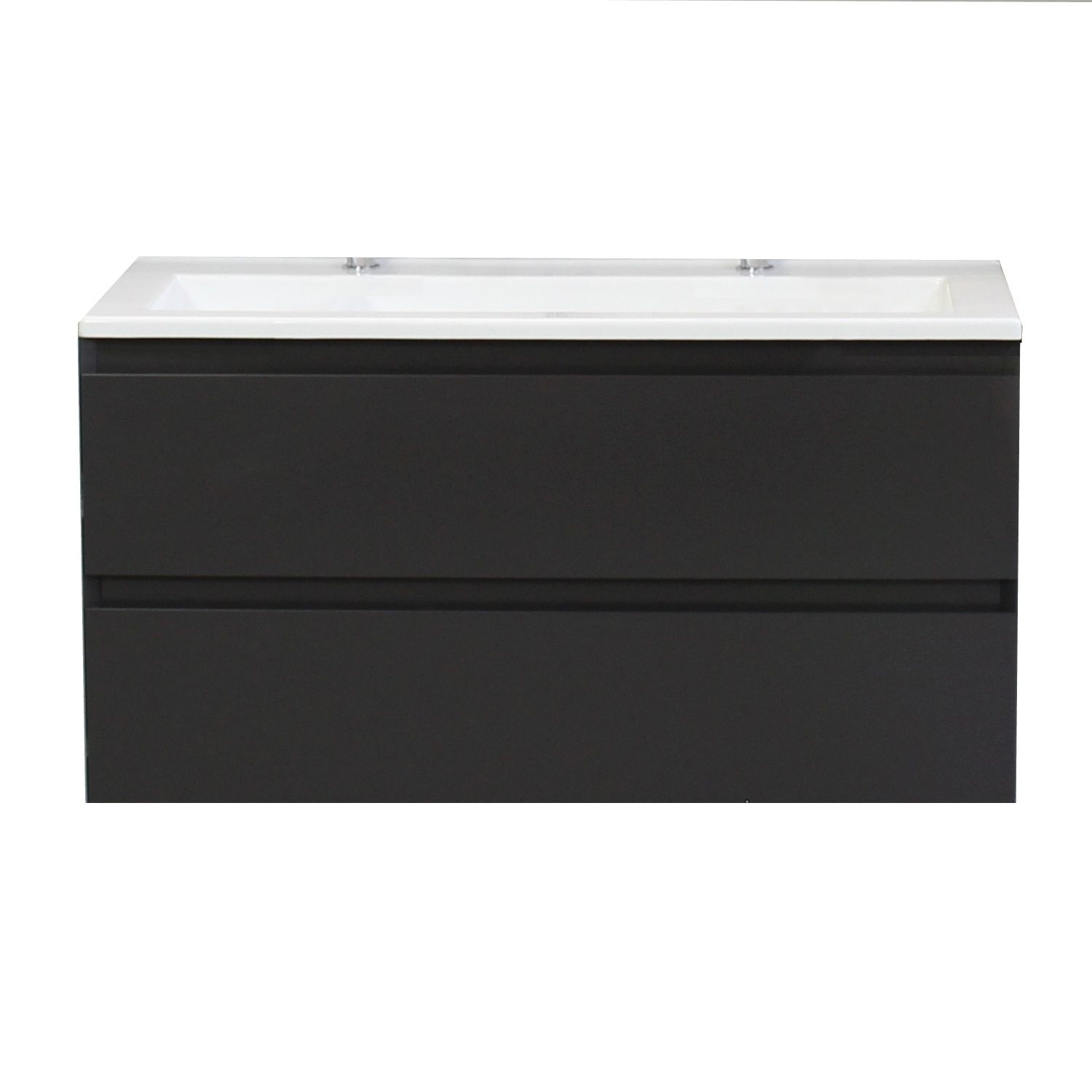 Het badkamermeubel van Boss & Wessing bestaat uit een onderkast en een brede wastafel die beschikt over 2 kraangaten. De onderkast is gemaakt van melamine en heeft 2 greeploze soft close lades, handig om al uw badkamer spullen in op te bergen. De onderkast heeft een antracieten kleur. De wastafel is van acryl en wordt geleverd in een witte kleur. Omdat de wastafel beschikt over 2 kraangaten heeft u de optie om een opbouwkranen toe te voegen aan uw wastafel (tegen een meerprijs). Doordat de wastafel beschikt over 2 kraangaten, hoeft u niet op uw beurt te wachten en kunt gemakkelijk tegelijk uw handen wassen.