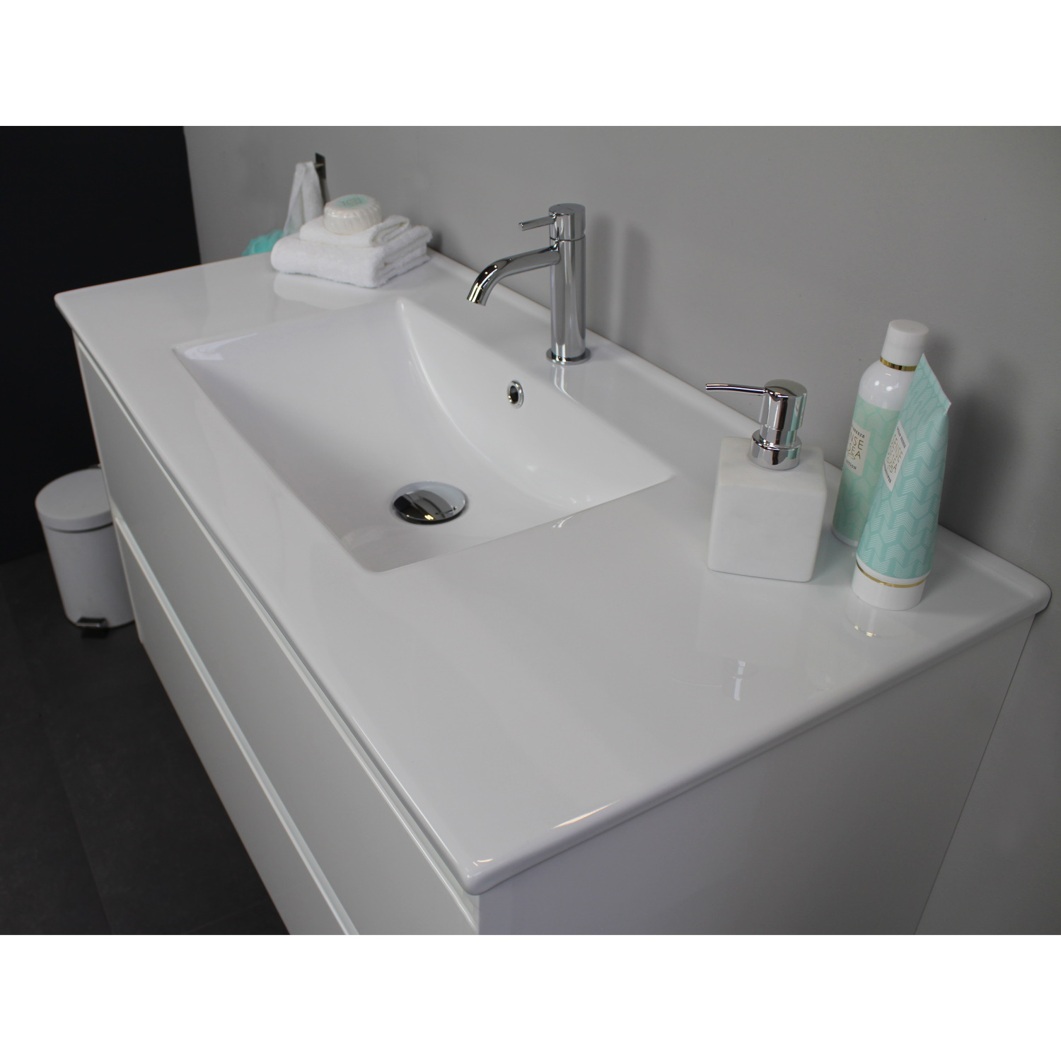 Het badkamermeubel van Boss & Wessing bestaat uit een onderkast en een wastafel en beschikt over 1 kraangat. De onderkast is gemaakt van melamine en heeft 2 greeploze softclose lades. De onderkast heeft een witte kleur. De wastafel is van porselein en wordt ook geleverd in een witte kleur. Omdat de wastafel beschikt over 1 kraangat heeft u de optie om een opbouwkraan toe te voegen aan uw wastafel. (tegen meerprijs). Het badmeubel heeft een breedte van 100 cm, een hoogte van 55 cm en een diepte van 46 cm. De set is verkrijgbaar in meerdere afmetingen en kleuren.