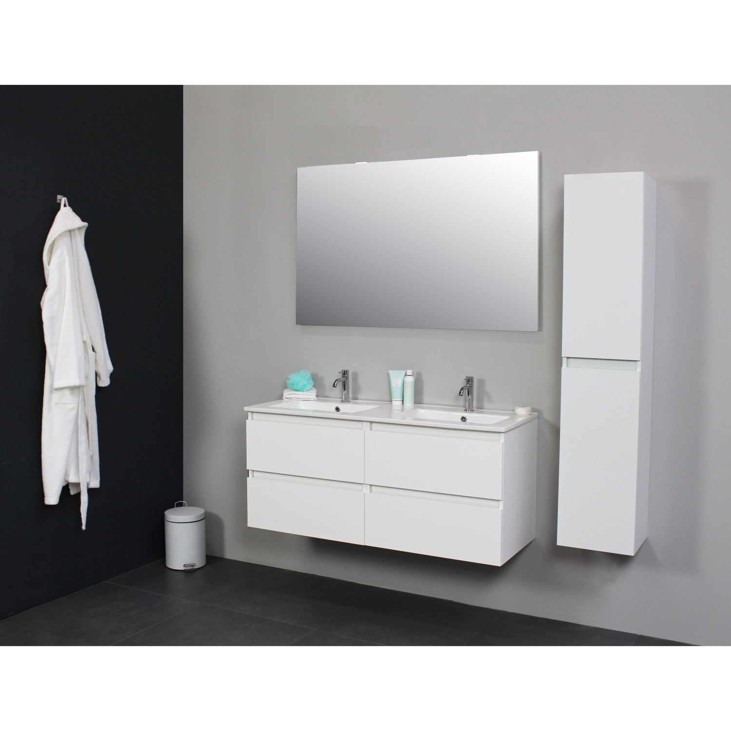 Omdat de wastafel beschikt over 2 kraangaten heeft u de optie om een opbouwkranen toe te voegen aan uw wastafel (tegen een meerprijs). Doordat de wastafel beschikt over 2 kraangaten, hoeft u niet op uw beurt te wachten en kunt gemakkelijk tegelijkertijd uw handen wassen. Het badmeubel heeft een breedte van 120 cm, een hoogte van 55 cm en een diepte van 46 cm. De set is verkrijgbaar in meerdere afmetingen en kleuren en wordt geleverd inclusief spiegel.