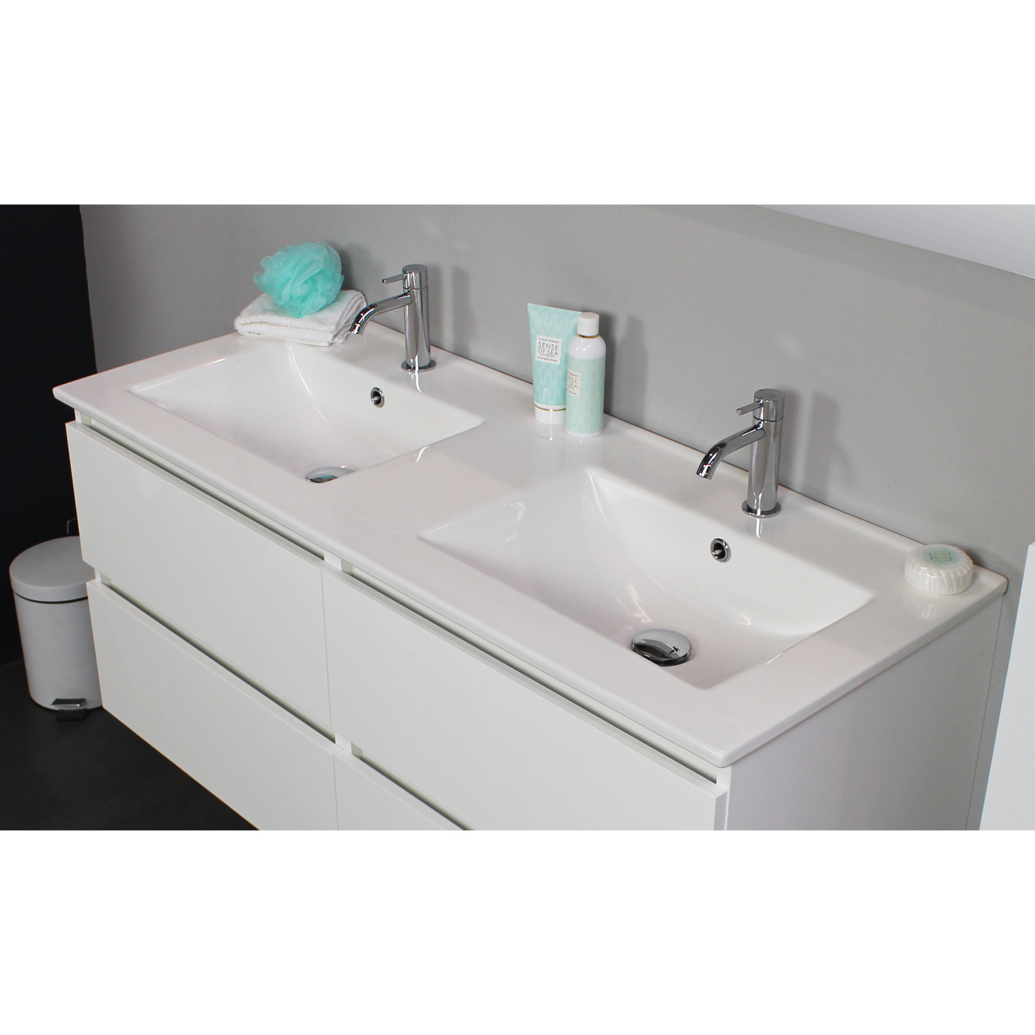 Het badkamermeubel van Boss & Wessing bestaat uit een onderkast en een brede wastafel die beschikt over 2 ruime wasbakken en 2 kraangaten. De onderkast is gemaakt van melamine en heeft 4 greeploze soft close lades, handig om al uw badkamer spullen in op te bergen. De onderkast heeft een hoogglans witte kleur. De wastafel is gemaakt van porselein en wordt geleverd in een witte kleur. Het voordeel van porselein is, is dat het harder is dan ander soort aardewerk. Daarnaast ook een stuk witter, waardoor het zorgt voor nog meer uitstraling in de badkamer.