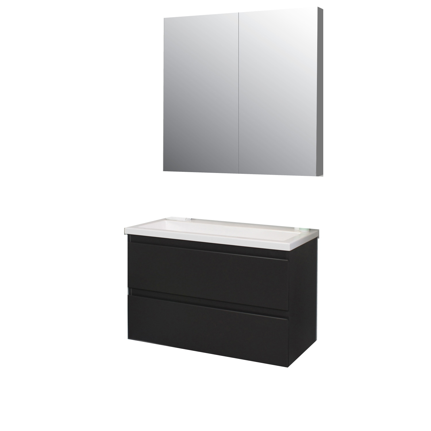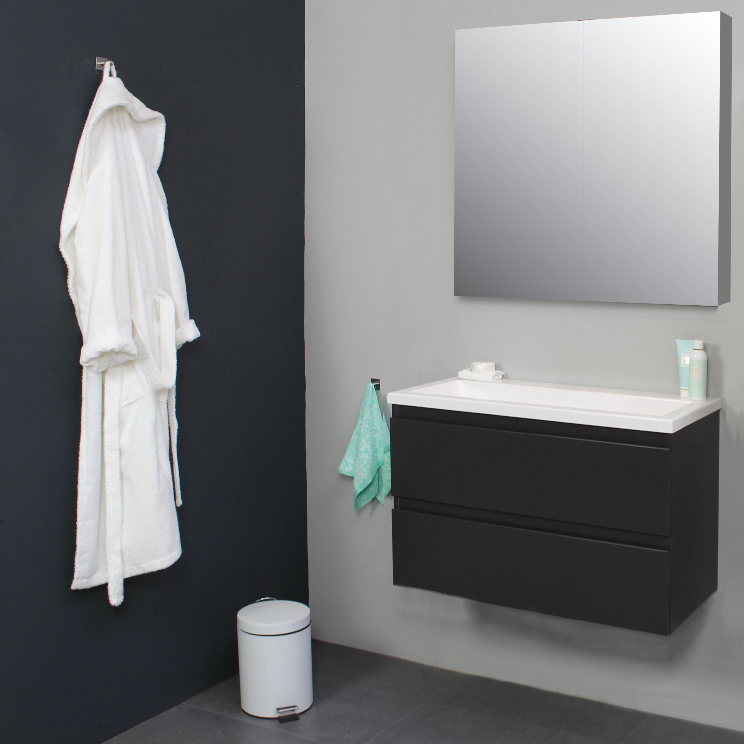 Dit prachtige badmeubel van Boss & Wessing beschikt over een antraciet kleurige onderkast met een wastafel die gemaakt is van acryl. Het badmeubel past met het moderne design bijna in iedere badkamer. De wastafel wordt geleverd zonder kraangat, waardoor u dus de keuze heeft om een inbouwkraan aan te sluiten op het badmeubel. Neem een kijkje op de website voor het ruime aanbod aan inbouw kranen. Het badmeubel wordt daarnaast geleverd inclusief grijze spiegel kast, waar u gemakkelijk uw badkamer artikelen in op kunt bergen. Ook is de kast eenvoudig te bedienen door middel van de 2 aparte deuren.