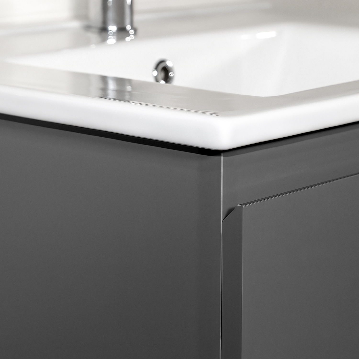 De onderkast van het Sally badkamermeubel is gemaakt van MDF en kent een bijzondere afwerking in de kleur mat antraciet. De onderkast kent een breedte van 100 cm, een diepte van 45,5 cm en een hoogte van 50 cm. De onderkast is uitgerust met twee soft-close lades waarin u diverse badkamerartikelen op kunt bergen. Het soft-close systeem zorgt ervoor dat de lades zacht en geruisloos sluiten na gebruik. Zo wordt eventuele schade aan de kast door een te hard dichtslaande lade voorkomen.