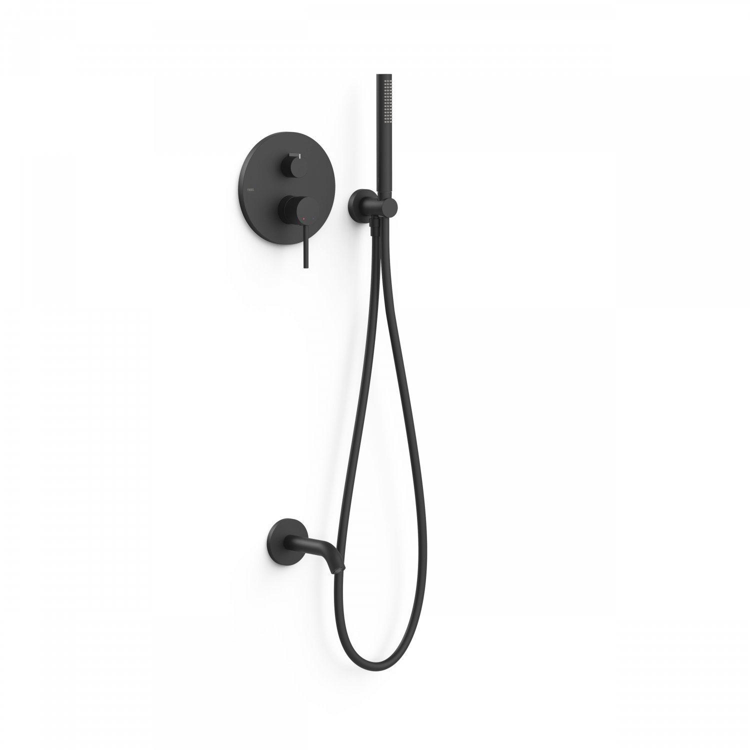 Houdt u van een strakke uitstraling en minimalisme? Kies dan voor een inbouwkraan in uw badkamer. Een groot gedeelte van de kraan zit in de muur verstopt, waardoor het op de muur rustig oogt. Deze set bestaat uit een badkraan met losse uitloop en een handdoucheset met staafhanddouche, handdouchehouder en doucheslang. Deze set is van messing in de kleur mat zwart. Dat is bijvoorbeeld mooi toe te passen in een stoere of industriële woonstijl.