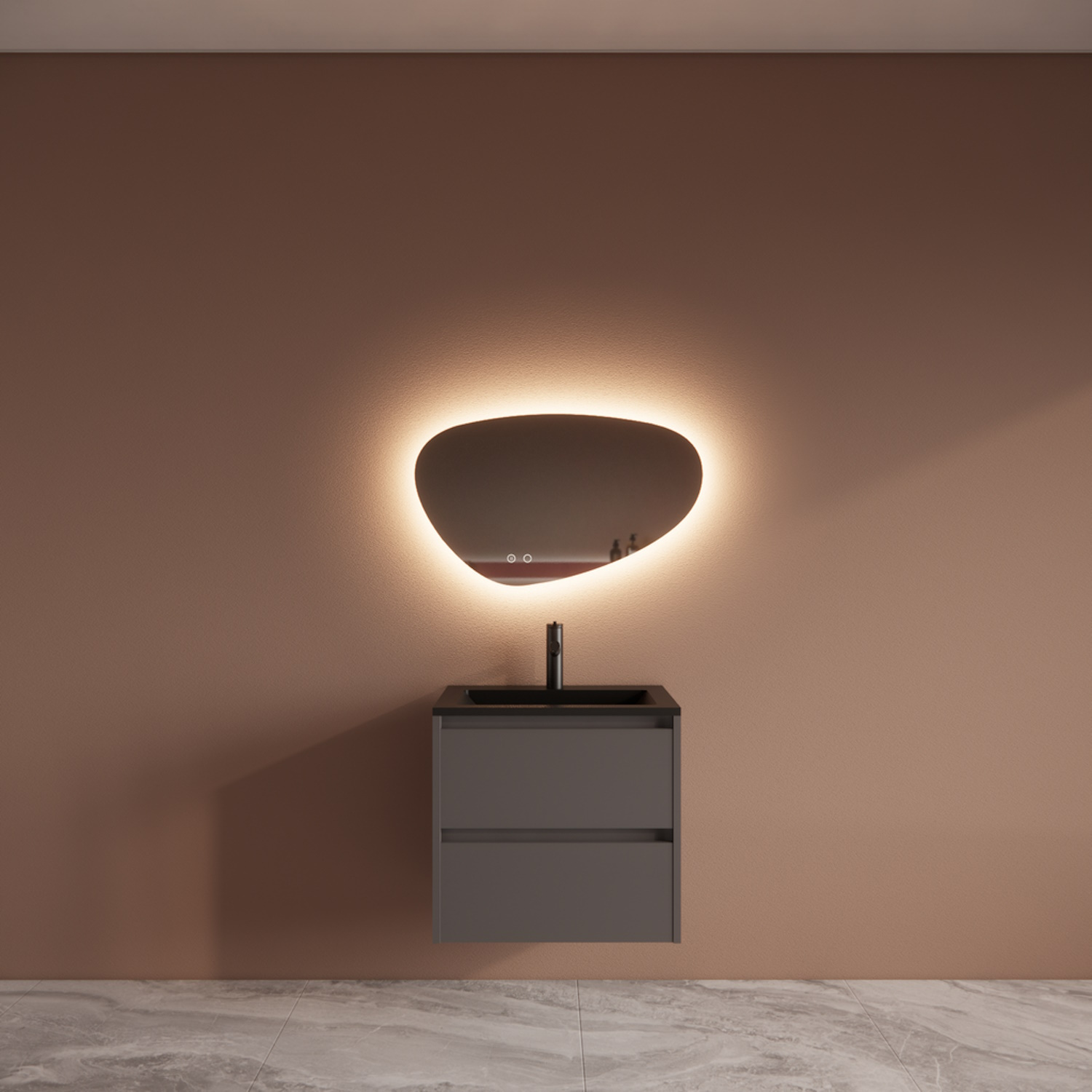 De wastafel is gemaakt van Cast Marble. Met een afmeting van maar liefst 60 cm breed en 45.5 cm diep dekt deze de volledige bovenkant van de onderkast. De onderkast word geleverd met mat zwarte wastafel. Dit meubel is op onze website ook verkrijgbaar met een Witte, Mat Witte of Cappuccino kleurige wastafel. De wastafel wordt standaard geleverd zonder kraangat, deze is te wijzigen naar een wastafel met 1 kraangat.