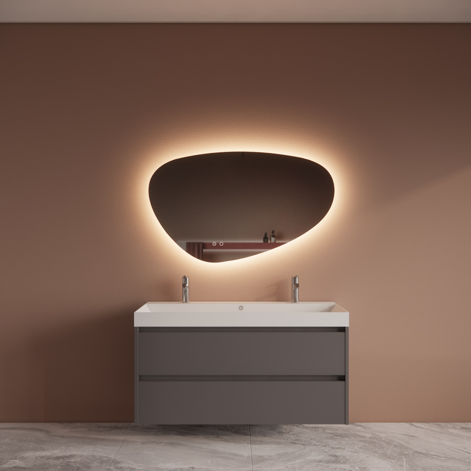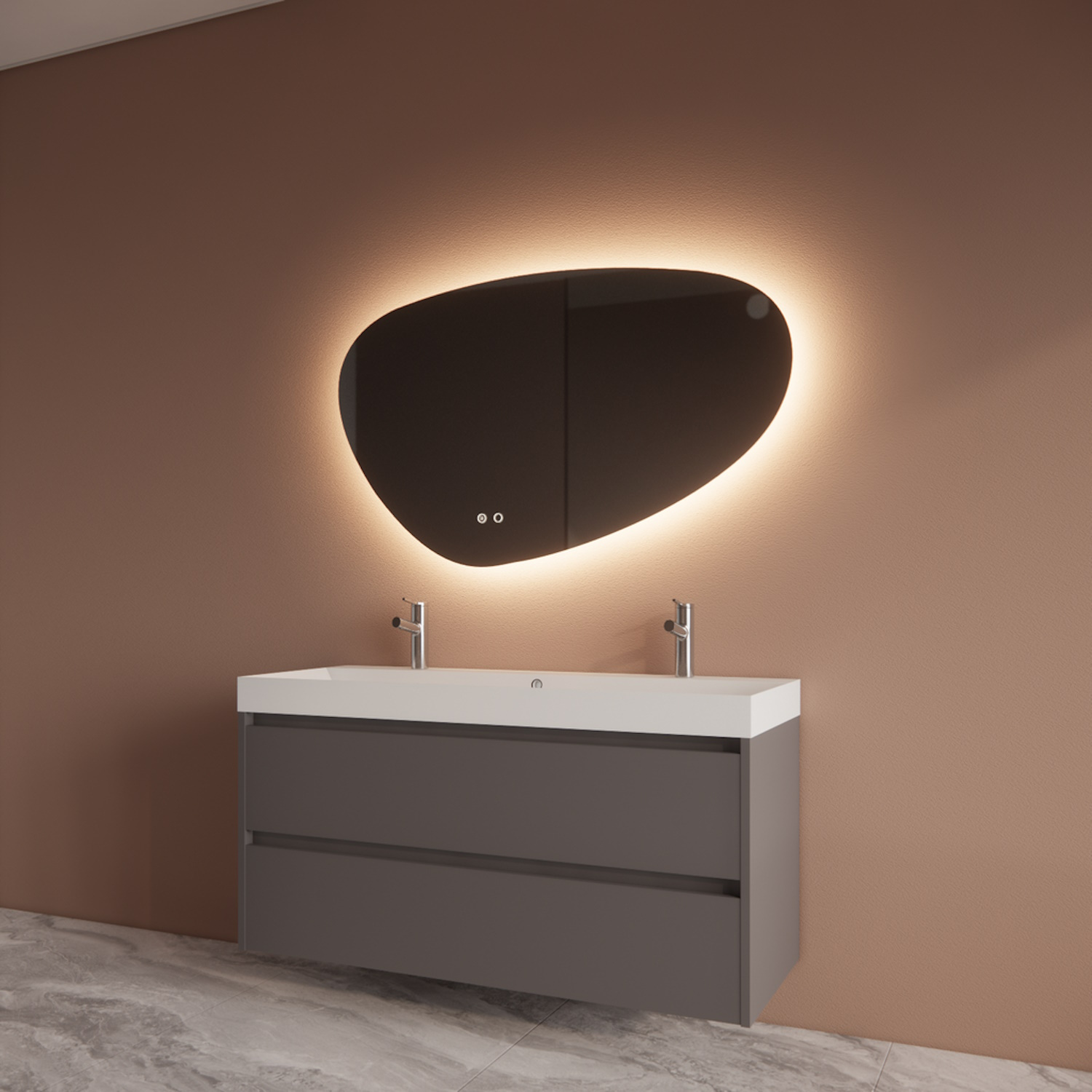 De onderkast van het meubel is gemaakt van 18 mm Melamine plaat (FSC Gekeurd). De twee lades van dit badkamermeubel zijn uitgevoerd met een soft-close techniek. Dit houd in dat wanneer de lade wordt gesloten, deze automatisch wordt afgeremd en zelf automatisch rustig sluit. Deze onderkast wordt voorgemonteerd geleverd.