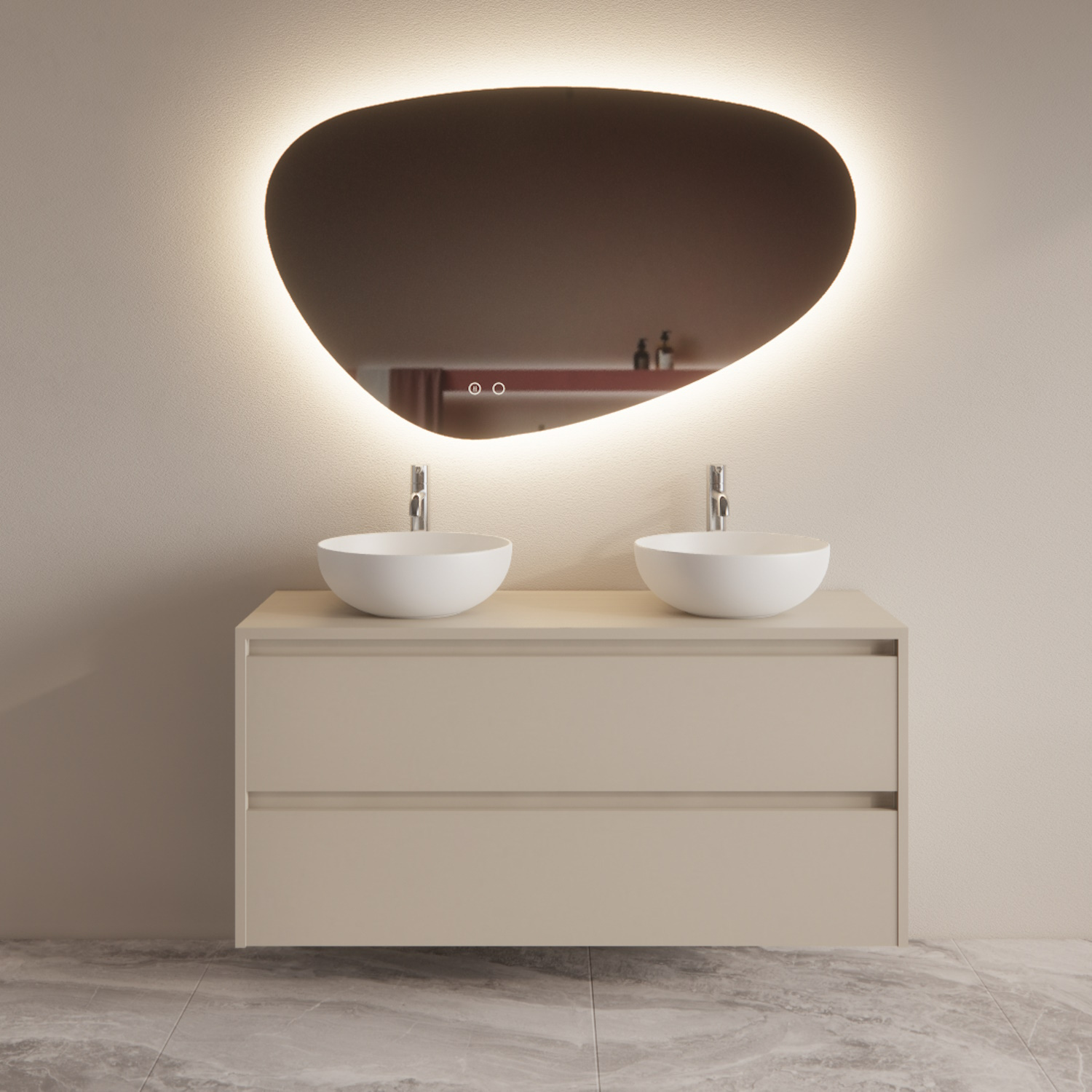 De onderkast van het meubel is gemaakt van 18 mm Melamine plaat (FSC Gekeurd). De twee lades van dit badkamermeubel zijn uitgevoerd met een soft-close techniek. Dit houd in dat wanneer de lade wordt gesloten, deze automatisch wordt afgeremd en zelf automatisch rustig sluit. Deze onderkast wordt voorgemonteerd geleverd.