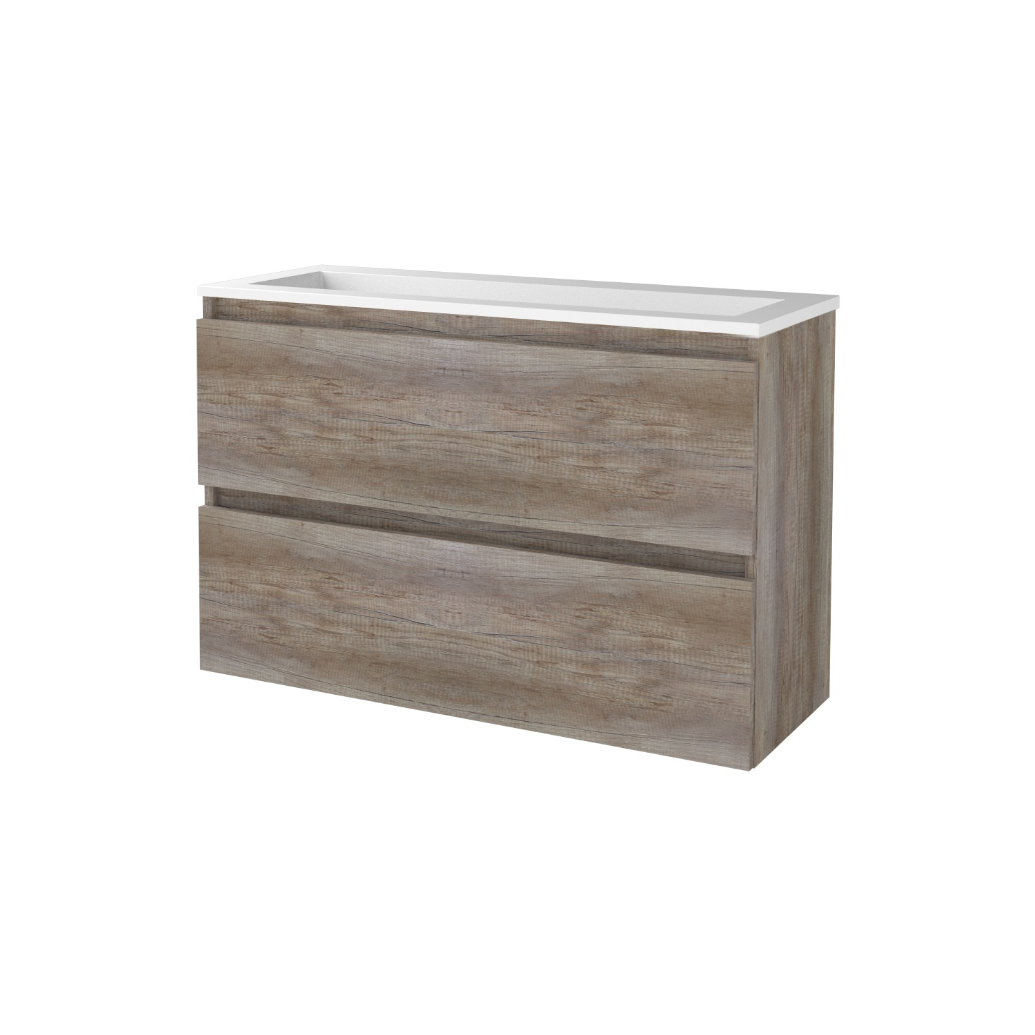 Deze mooie badmeubelset van Aquasplash komt uit de serie Salt, hij is gemaakt van gelakt Melamine in de kleur Scotch Oak. De hoogte van dit meubel is 65 cm, de breedte van dit meubel is 100 cm en de diepte is 39 cm. De wastafel die in deze set zit is gemaakt van Acryl in een witte kleur.