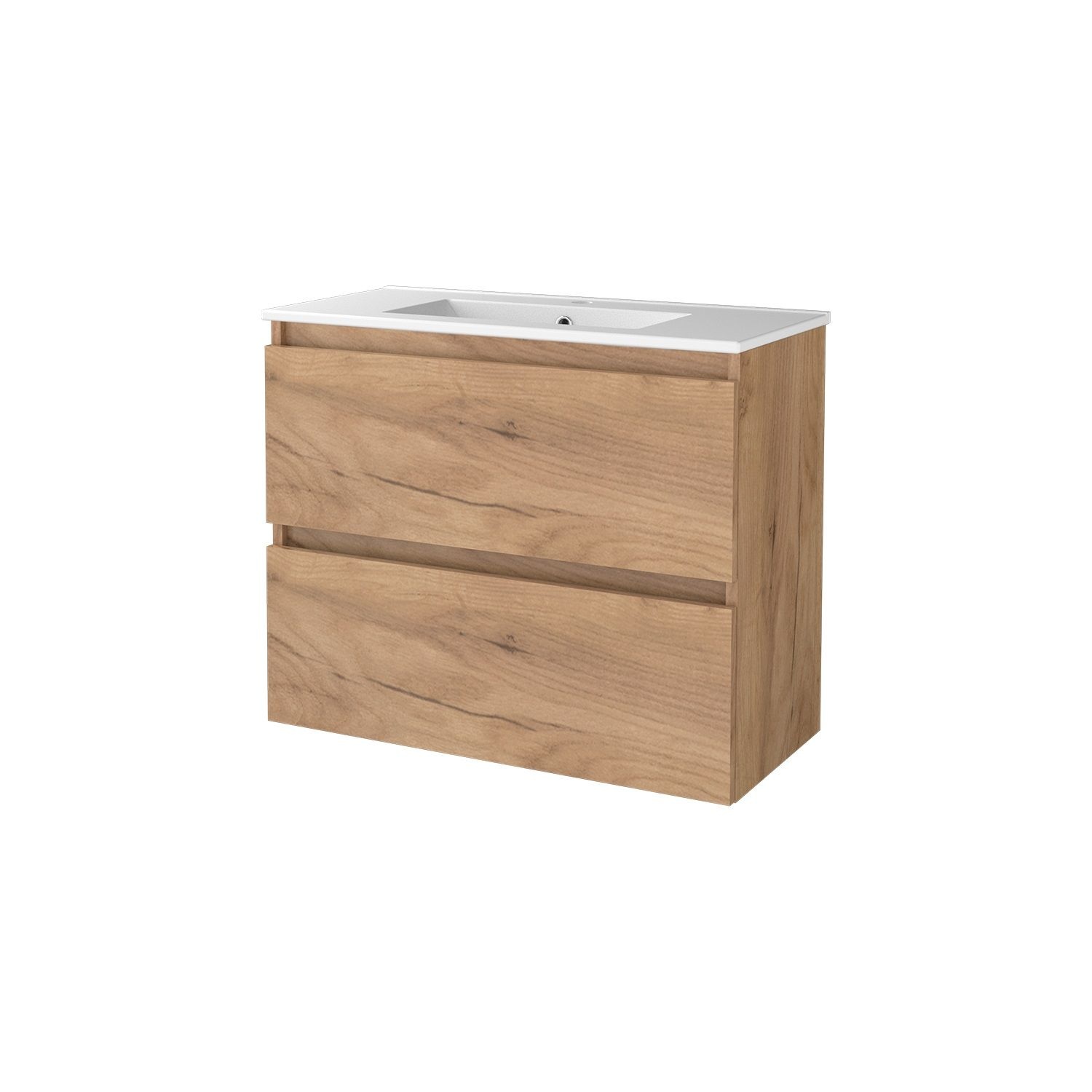 Deze mooie badmeubelset van Aquasplash komt uit de serie Salt, hij is gemaakt van gelakt Melamine in de kleur Whisky Oak. De hoogte van dit meubel is 65 cm, de breedte van dit meubel is 80 cm en de diepte is 39 cm. De wastafel die in deze set zit is gemaakt van Porselein in een witte kleur.