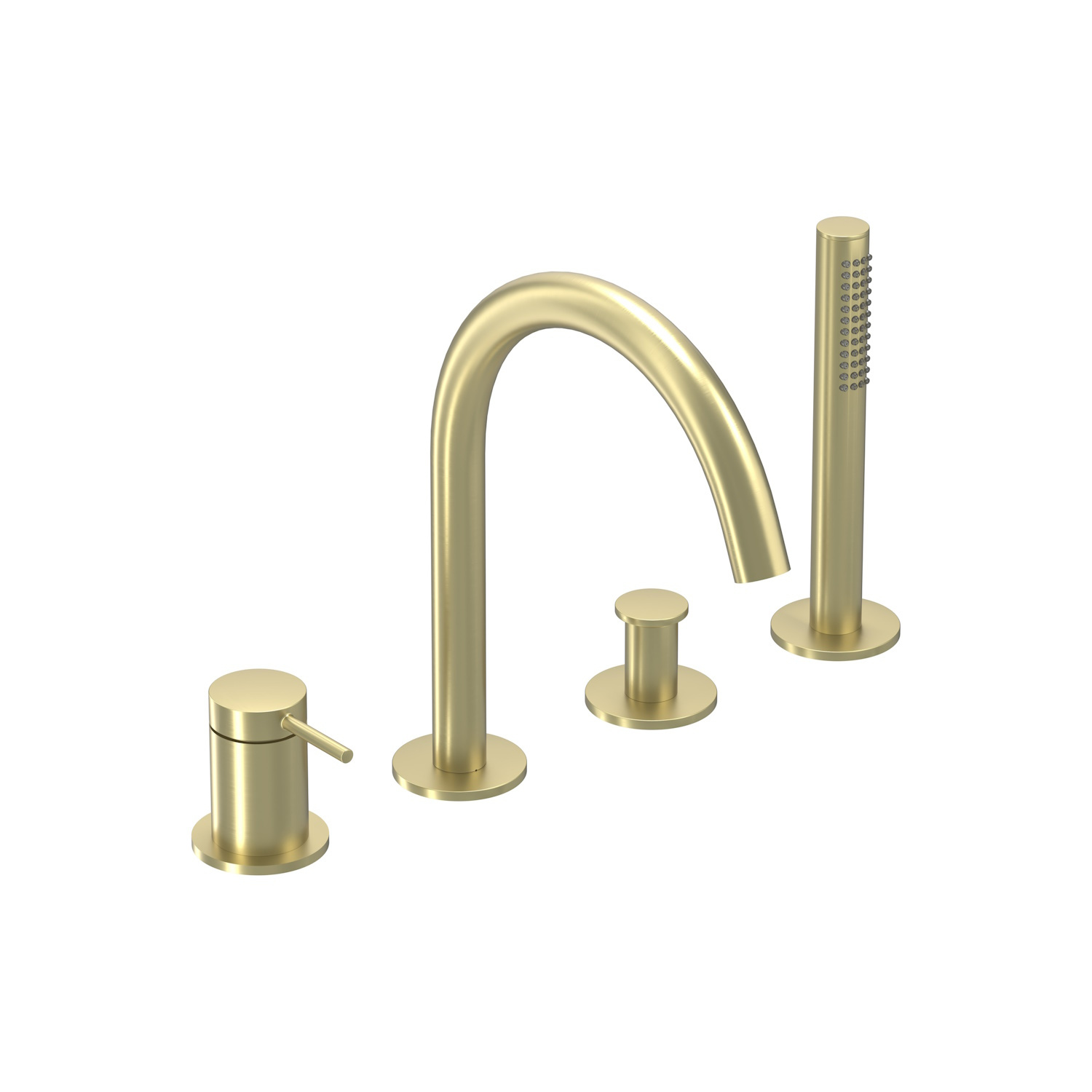 Deze badrandcombinatie is van het merk IVY uit de serie Bond en is goud van kleur met een geborstelde matte afwerking. De Badrandcombinatie bestaat uit een mengkraan, omstelkraan, handdouche en een kraan en is gemaakt van hoogwaardig messing. De uittrekbare handdouche biedt extra gemak en flexibiliteit bij het wassen en schoonmaken. De 4-gats mengkraan zorgt voor een nauwkeurige controle over de watertemperatuur en -druk, waardoor je altijd kunt genieten van een ontspannende bad ervaring. De badrandcombinatie zorgt voor een strakke afwerking, doordat de badrandcombinatie gemonteerd dient te worden in de rand van het ligbad.