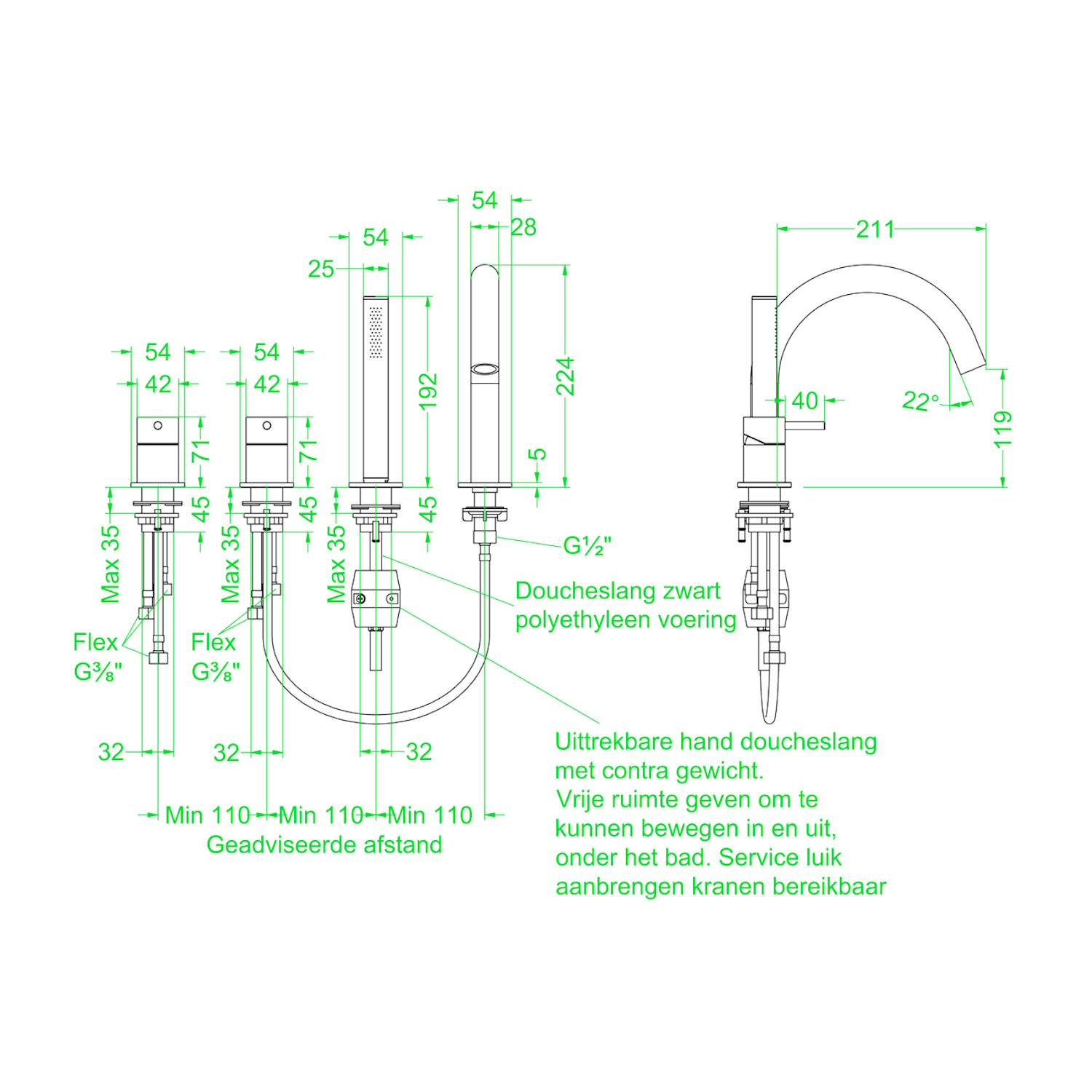 De mengkraan heeft een hoogte van 7,1 cm en een breedte van 4,2 cm. De omstelkraan heeft een hoogte van 7,1 cm en een breedte van 4,2 cm. De handdouche heeft een hoogte van 19,2 cm en een breedte van 2,5 cm. De kraan heeft een hoogte van 22,4 cm en een breedte van 5,4 cm. De lengte van de uitloop van de kraan is 21,1 cm. De minimale geadviseerde afstand tussen de kranen is 11 cm.