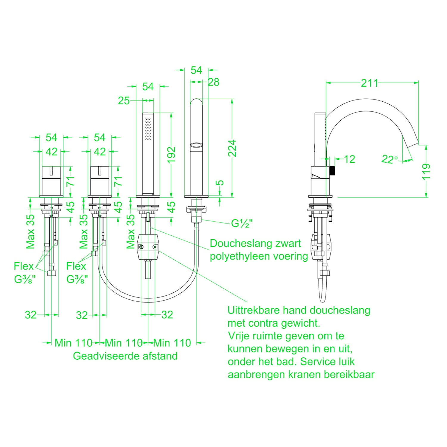 De mengkraan heeft een hoogte van 7,1 cm en een breedte van 4,2 cm. De omstelkraan heeft een hoogte van 7,1 cm en een breedte van 4,2 cm. De handdouche heeft een hoogte van 19,2 cm en een breedte van 2,5 cm. De kraan heeft een hoogte van 22,4 cm en een breedte van 5,4 cm. De lengte van de uitloop van de kraan is 21,1 cm. De minimale geadviseerde afstand tussen de kranen is 11 cm.