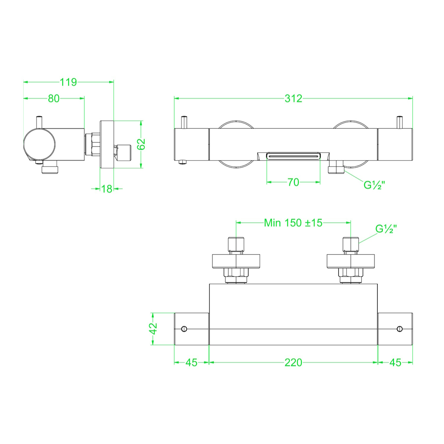 De douchethermostaatkraan heeft een breedte van 31,2 cm en een diepte van 11,9 cm. De kraan heeft hoogte van 6,2 cm en een HOH-maat van 15 cm - 16,5 cm. De maat van de draadaansluiting is 1/2 inch.