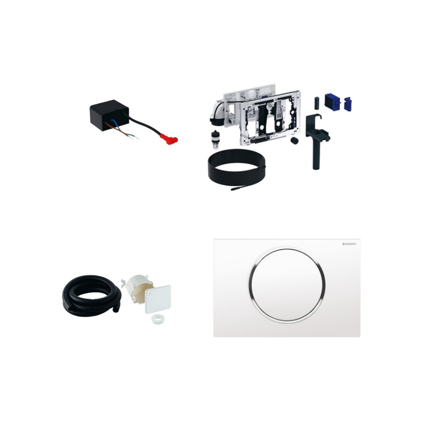 Deze set bestaat uit een zwarte bedieningsplaat en een DuoFresh module met geurzuivering, toiletstickhouder en handmatige of automatische activering. Het voedingsapparaat en de ruwbouwset zijn ook in de set te verkrijgen. Allemaal van het merk Geberit en passen perfect bij elkaar.