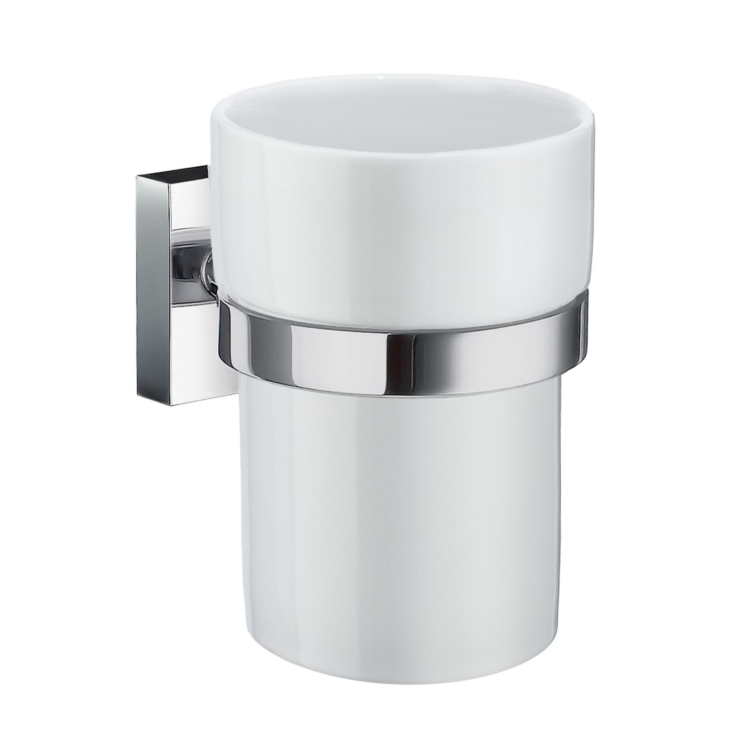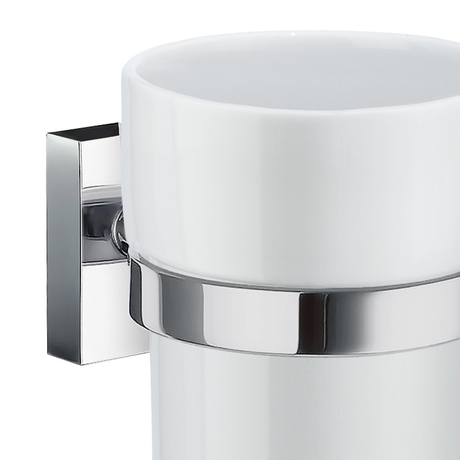 De combinatie van chroom en porselein maakt deze bekerhouder een tijdloos item voor aan de wand. De met chroom afgewerkte bekerhouder kan bevestigd worden met bijgeleverde schroeven of u kunt kiezen voor een montagelijm oplossing (niet bijgeleverd).