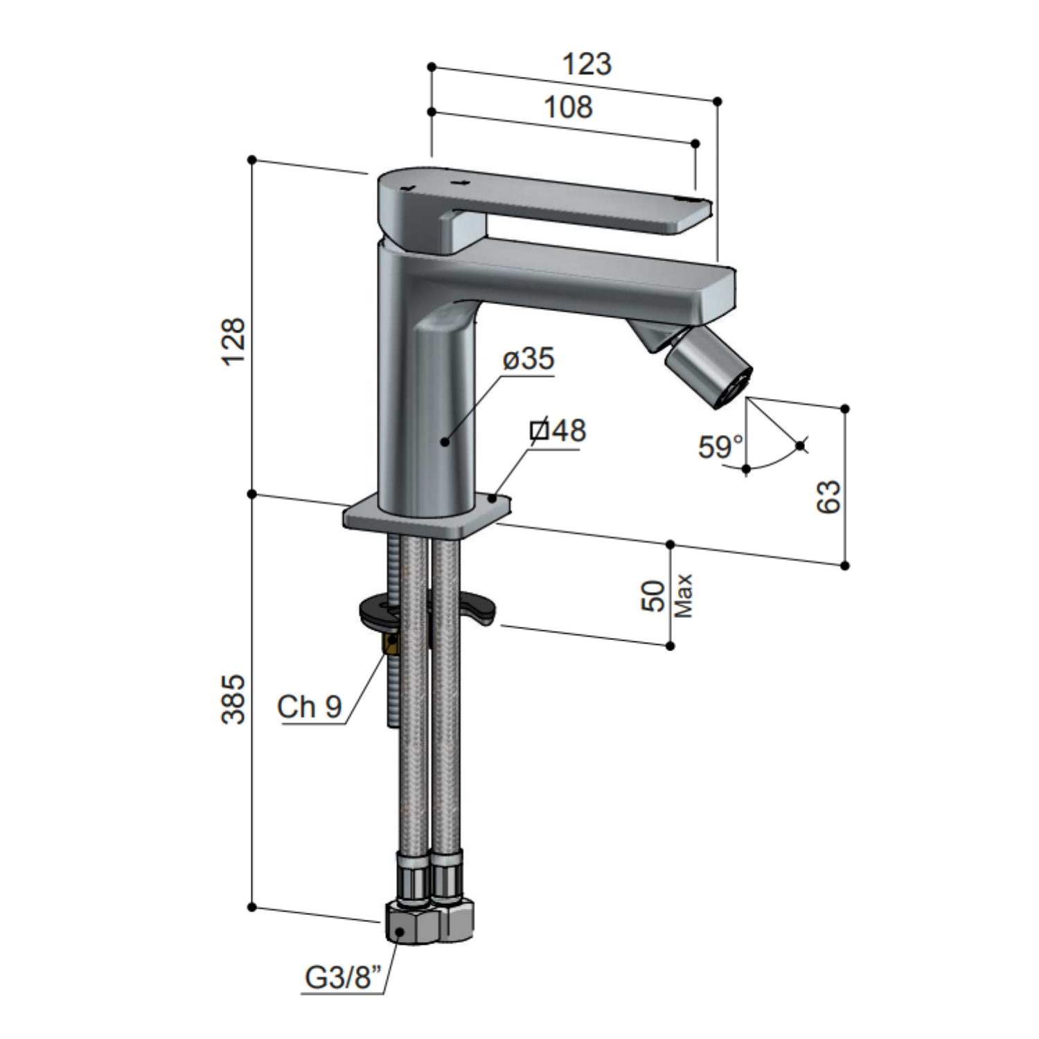 De kraan heeft een draadaansluiting van 3/8". Daarnaast zijn de aansluitslangen 38,5 cm. De kraan wordt zonder waste geleverd. De kraan geeft maximaal 6.8 liter water per minuut.