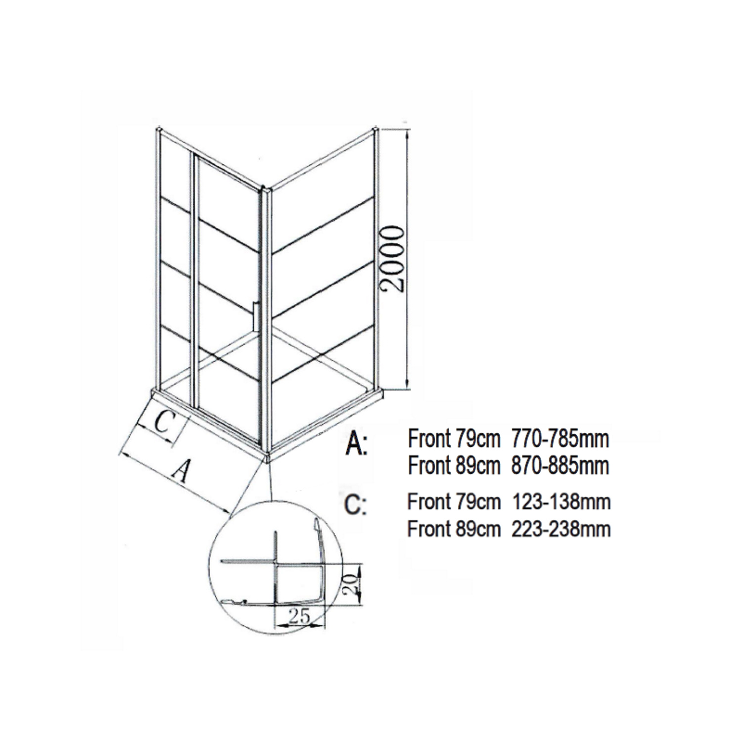 De nisdeur kent een breedte van 89 cm en een hoogte van 200 cm. De douchewand is in breedte van 87 cm tot 88.5 cm te verstellen. Het heldere glas kent een dikte van 8 mm en is voorzien van NANO Coating veiligheidsglas: dit zorgt ervoor dat er geen ongewenst vuil en kalk achterblijft op het glas. Het water loopt makkelijk van de wand af en de coating zorgt voor een glanzende uitstraling. Dit zal tijd besparen met schoonmaken.