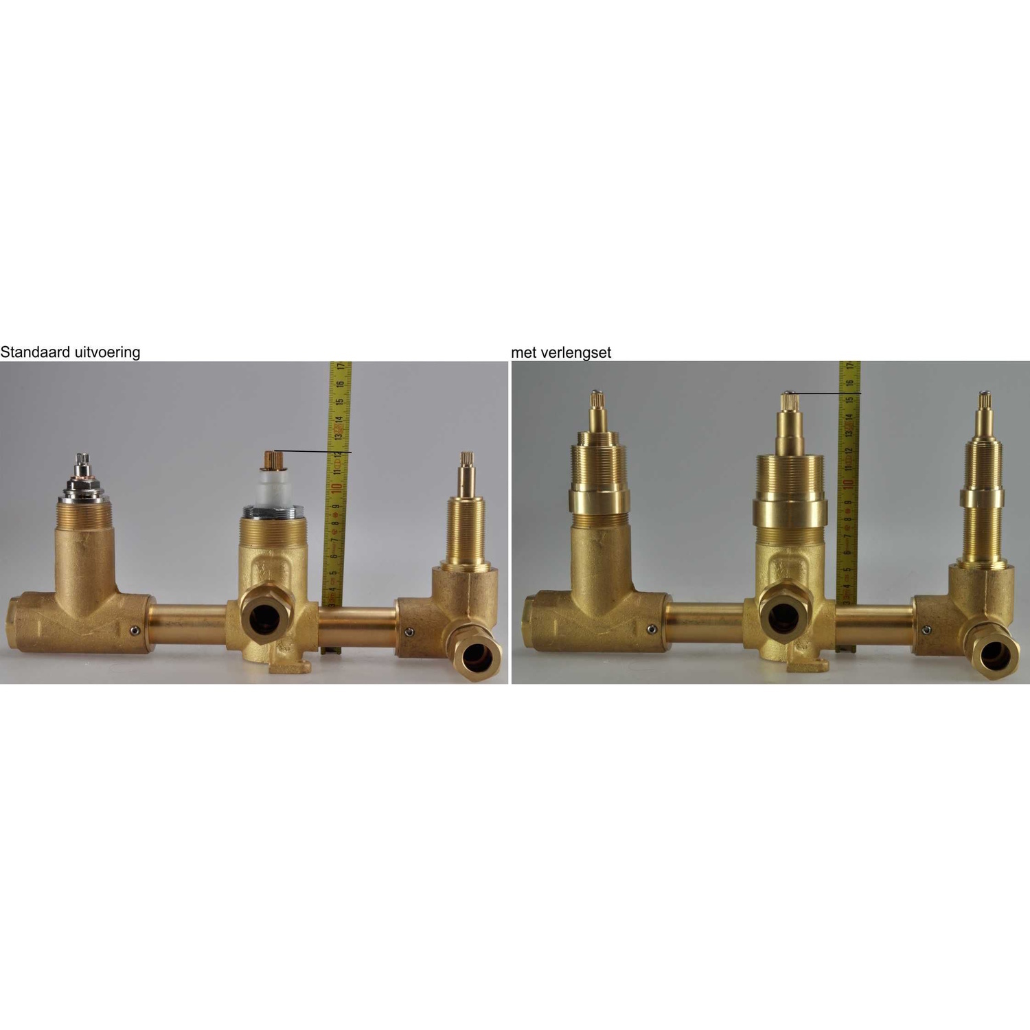 Wanneer onverhoopt blijkt dat de inbouwkraan te diep in de muur zit waardoor de bedieningsknopppen niet meer te monteren zijn, biedt deze set de mogelijkheid de spindels met ruim 3 centimeter te verlengen, waardoor uithakken en opnieuw tegelen voorkomen wordt!