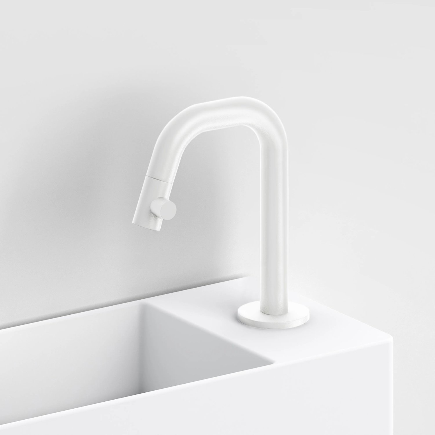 Deze mat witte fonteinkraan uit de Kaldur serie van Clou is een echt eyecatcher in de toiletruimte. De strakke vormgeving past bij vrijwel iedere stijl. Zo slank als de staande koudwaterkraan de wastafel siert. Bij deze staande kraan is goed te zien wat de Kaldur kraan nu zo anders maakt dan andere kranen, namelijk de uitzonderlijk slanke vorm en dat slimme ontwerp. Kaldur kranen hebben een diameter van slechts 20mm is uniek in de markt. Om dit mogelijk te maken heeft Clou speciaal een nieuw keramisch binnenwerk ontwikkeld. Door het slanke design is deze Kaldur fonteinkraan absoluut tijdloos.