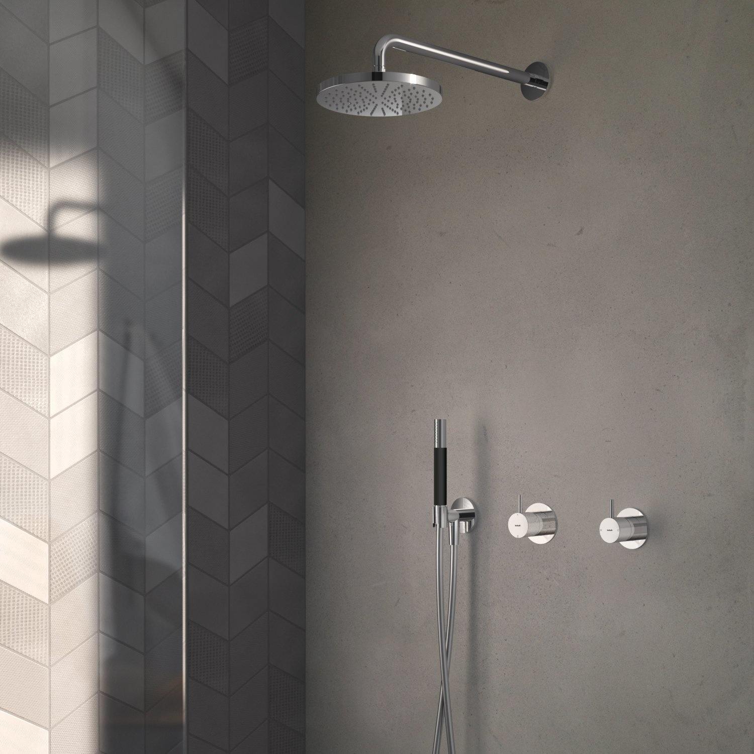 Naast de ingebouwde stopkranen wordt deze basisset geleverd met een hoofddouche, bijpassende ronde muuruitloop of plafonduitloop, een handdouche en een wandsteun of glijstang.