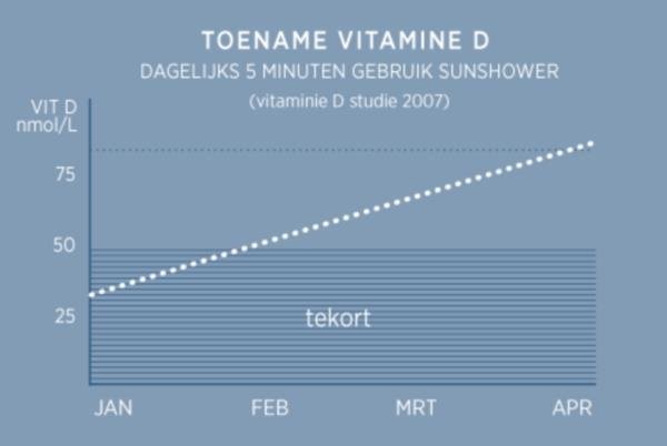 Zonlicht is een bron van vitaliteit, zorgt voor een opgewekt gevoel en de aanmaak van vitamine D. De UV output van de Sunshower Deluxe Black is vergelijkbaar met de zomerzon in Nederland. Door de Sunshower regelmatig, maar kort te gebruiken tijdens het douchen kan de huid geleidelijk aan wennen aan het zonlicht. De huid maakt hierdoor op een natuurlijke wijze pigment aan. Dit zorgt op een verantwoorde wijze voor een gezond zomers kleurtje. Daarnaast blijft het vitamine D niveau in de wintermaanden door gebruik van de Sunshower op een gezond zomers peil. Vitamine D geeft energie, zorgt voor een verhoogde weerstand, sterke botten en werkt preventief tegen verschillende vormen van kanker.
