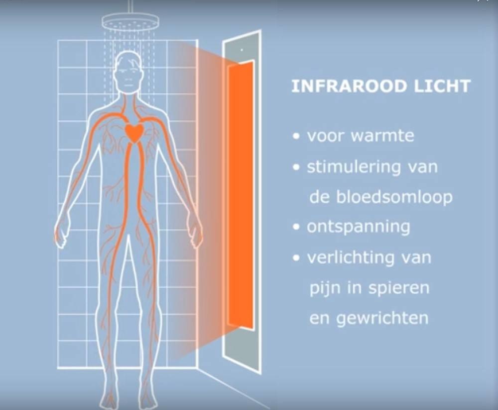 De Sunshower maakt gebruik van korte golf infrarood. Deze infrarood zorgt voor een directe aangename warmte en dringt diep door in de huid. Stijve spieren en gewrichten worden opgewarmd waardoor ze soepel worden en minder pijnlijk aanvoelen. Deze therapeutische lampen worden vaak toegepast bij mensen met rugklachten, nekklachten, reuma en vergelijkbare aandoeningen. Door de infrarood sessie te combineren met de dagelijkse douchebeurt gaat de kwaliteit van het leven omhoog, zonder dat het extra tijd in beslag neemt.
