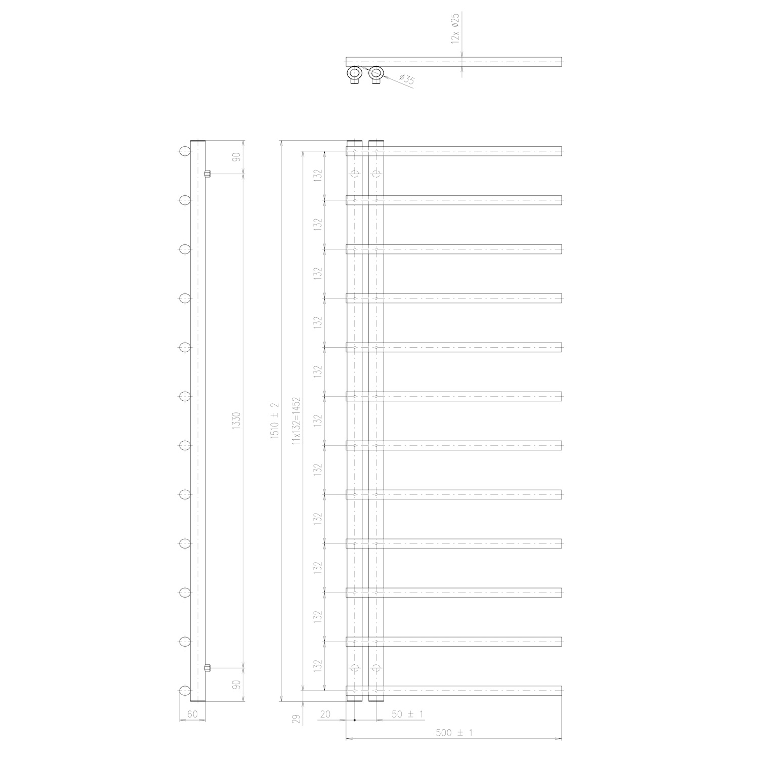 Let op! De verwarmingsstaaf maakt geen deel uit van de radiator.