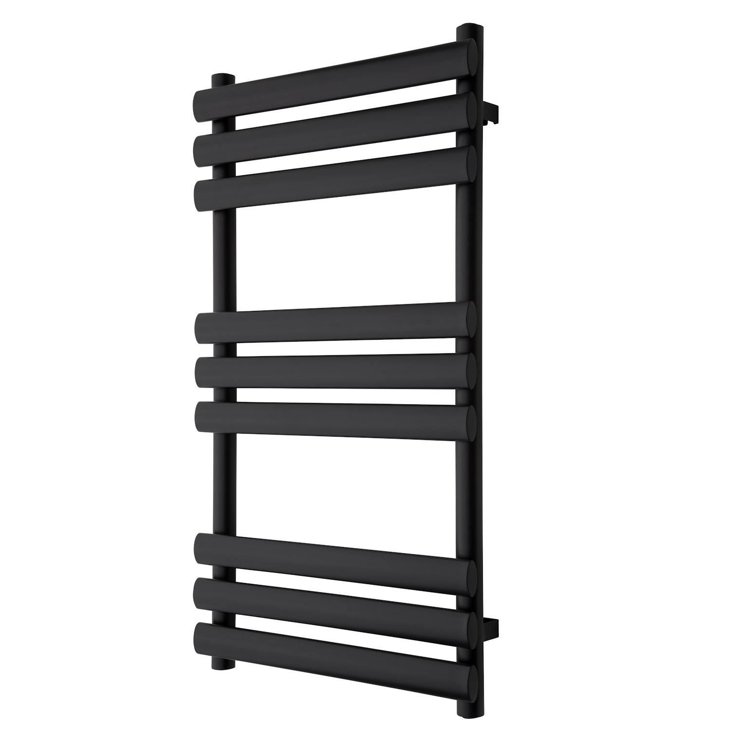 Bent u op zoek naar een designradiator met voor in uw moderne badkamer? Dan is deze radiator van TVS uit de serie Milo iets voor u. Deze zwarte radiator is 94 cm hoog en 52 cm breed. Hij bestaat uit 2 verticale buizen en 3 setjes van 3 horizontale, platte buizen. Deze radiator heeft 4 stalen bevestigingspunten aan de achterkant zitten, waardoor u hem aan de muur kunt bevestigen. De radiator is geschikt voor zowel de centrale verwarming als elektrisch en hij heeft een capaciteit van 300 Watt. Door deze radiator te plaatsen, krijgt u badkamer een moderne look met de luxe van een warme handdoek na het douchen. Zo komen design en comfort samen.