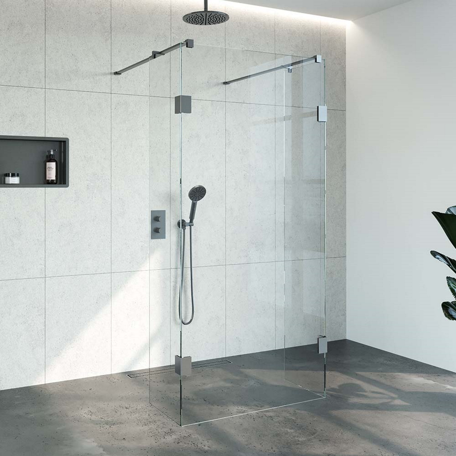 Als u graag minimalisme in uw badkamer wilt, is een doorloopdouche een goede keuze. Deze complete doorloopdouche bestaat uit een doorloopwand met twee vaste zijwanden. De doorloopwand is 100 cm breed en 200 cm hoog. De zijwanden zijn beide ongeveer 40 cm breed. Inclusief glasbehandeling. Deze doorloopdouche straalt luxe en rust uit door zijn design en Gunmetalkleur accenten.