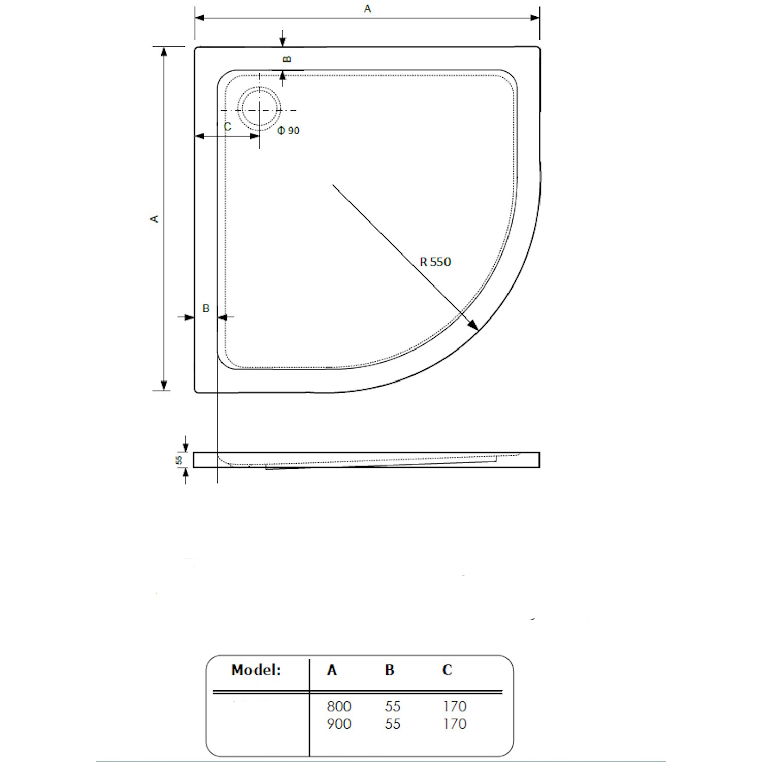 De douchebak heeft een afmeting van 80 cm bij 80 cm en een hoogte van 3 cm.
