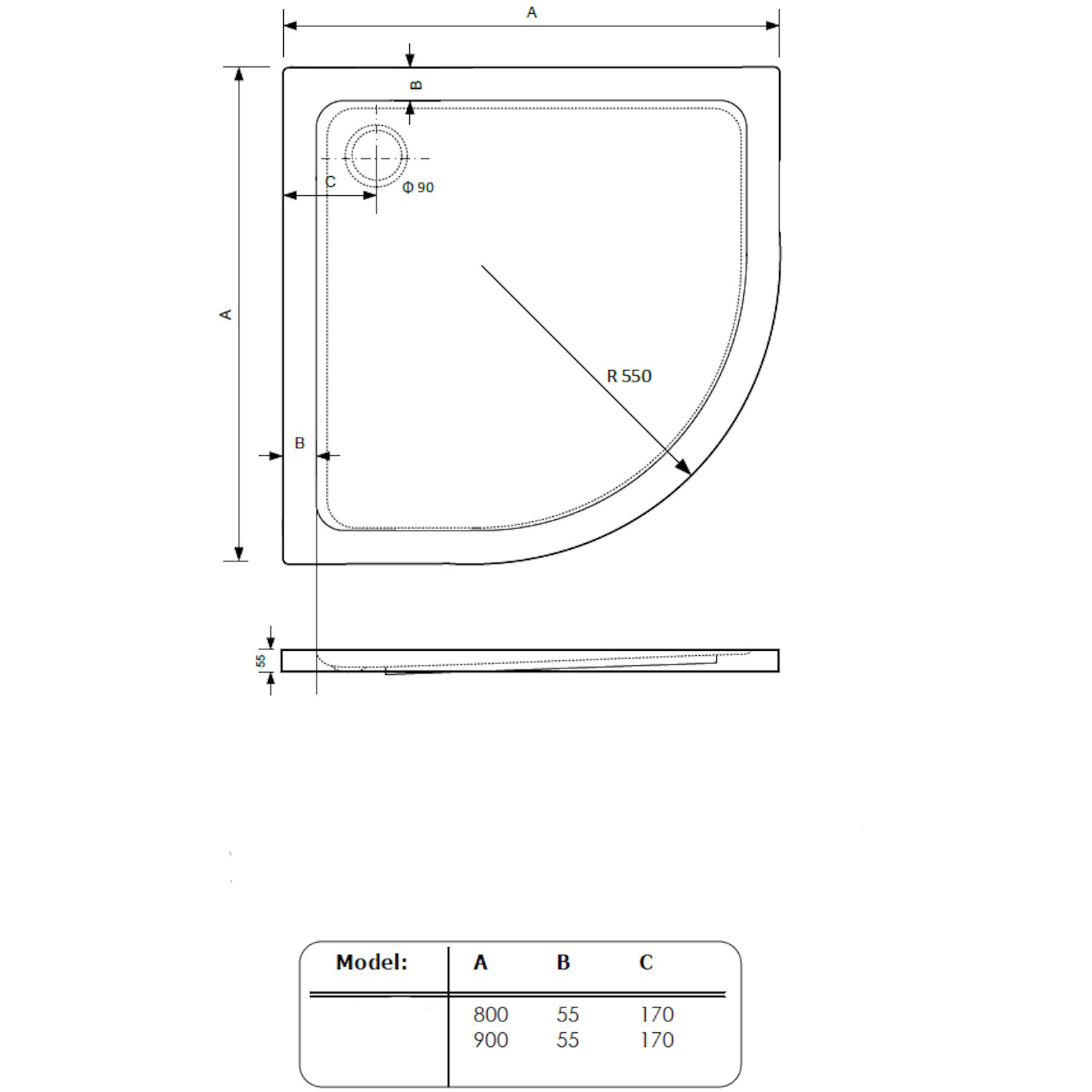 De douchebak heeft een afmeting van 90 cm bij 90 cm en een hoogte van 3 cm.