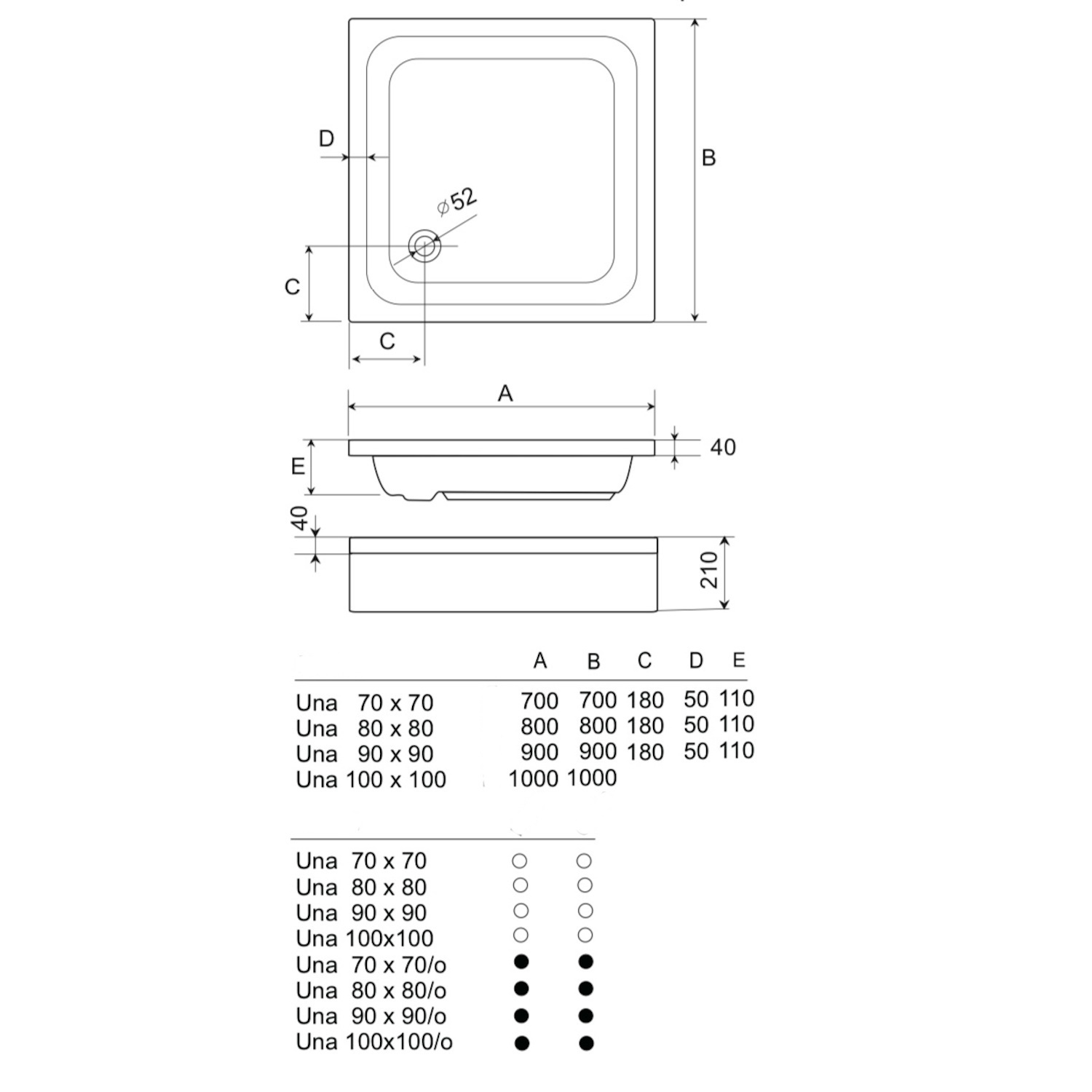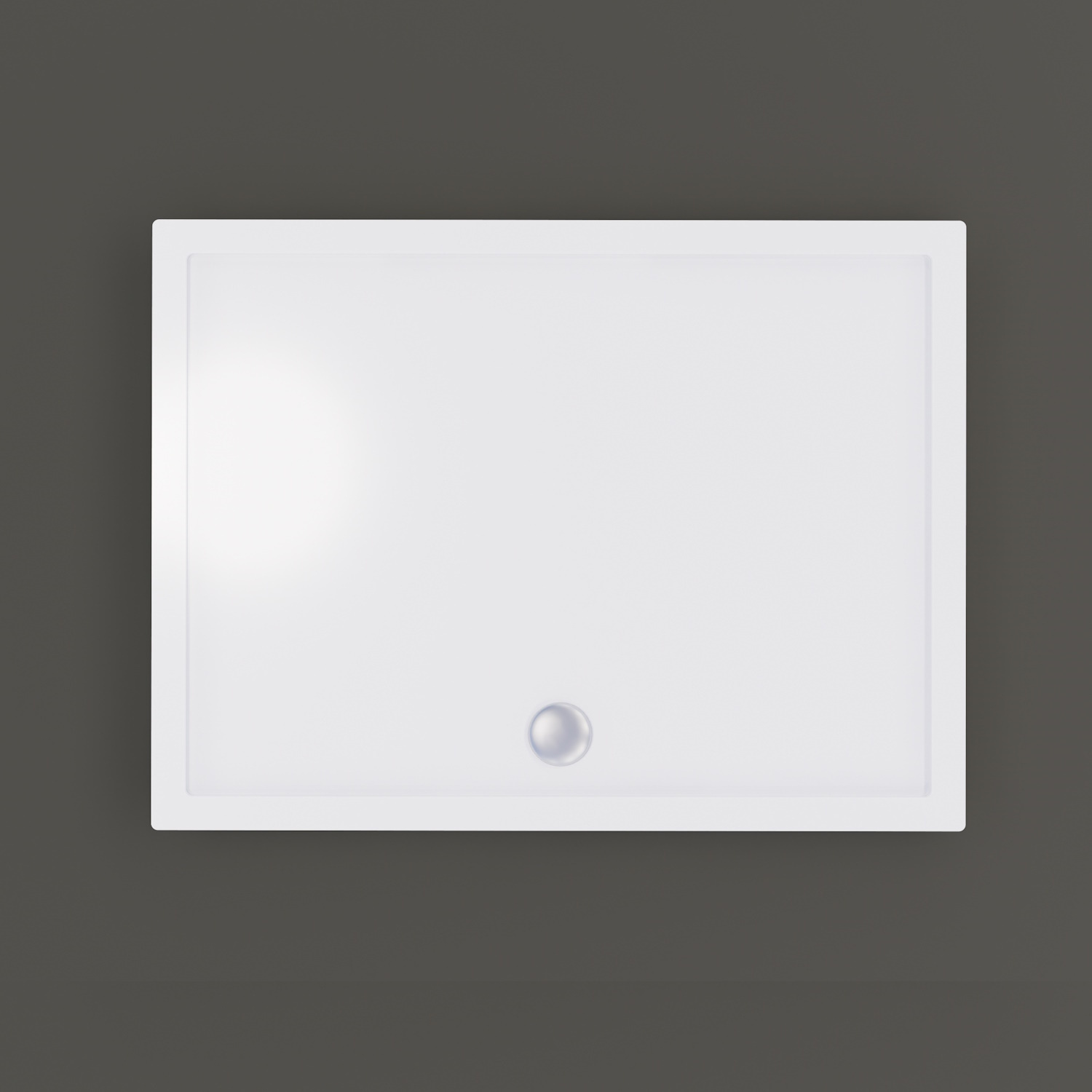 De douchebak heeft een afmeting van 90 cm bij 75 cm. De douchebak heeft een diepte van 11 cm, de douchebakrand heeft een hoogte van 4 cm, in combinatie met de plint heeft hij een hoogte van 21 cm.