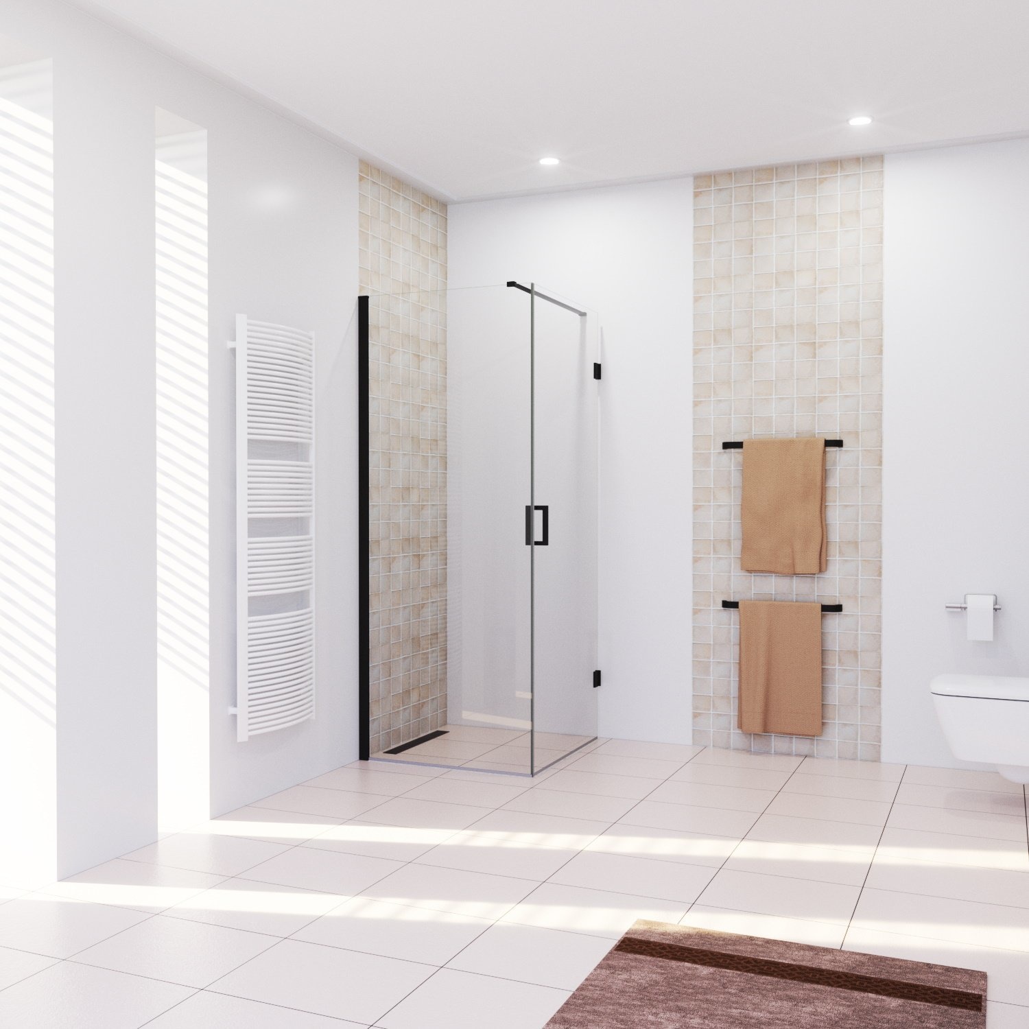De Moderna douchecabine van het merk Boss & Wessing staat garant voor kwaliteit en design. De cabine bestaat uit een vaste douchewand met een breedte van 120 cm en een draaibare douchedeur met een breedte van 80 cm. De profielloze douchedeur beschikt over scharnierbladen en een verticale greep die zijn afgewerkt in de kleur mat zwart. De douchewand is wel uitgerust met een profiel waardoor de wand een verstelbaarheid van 2 cm heeft. De vaste douchewand wordt geleverd inclusief stabilisatiestang en een muurprofiel, eveneens afgewerkt in de kleur mat zwart.