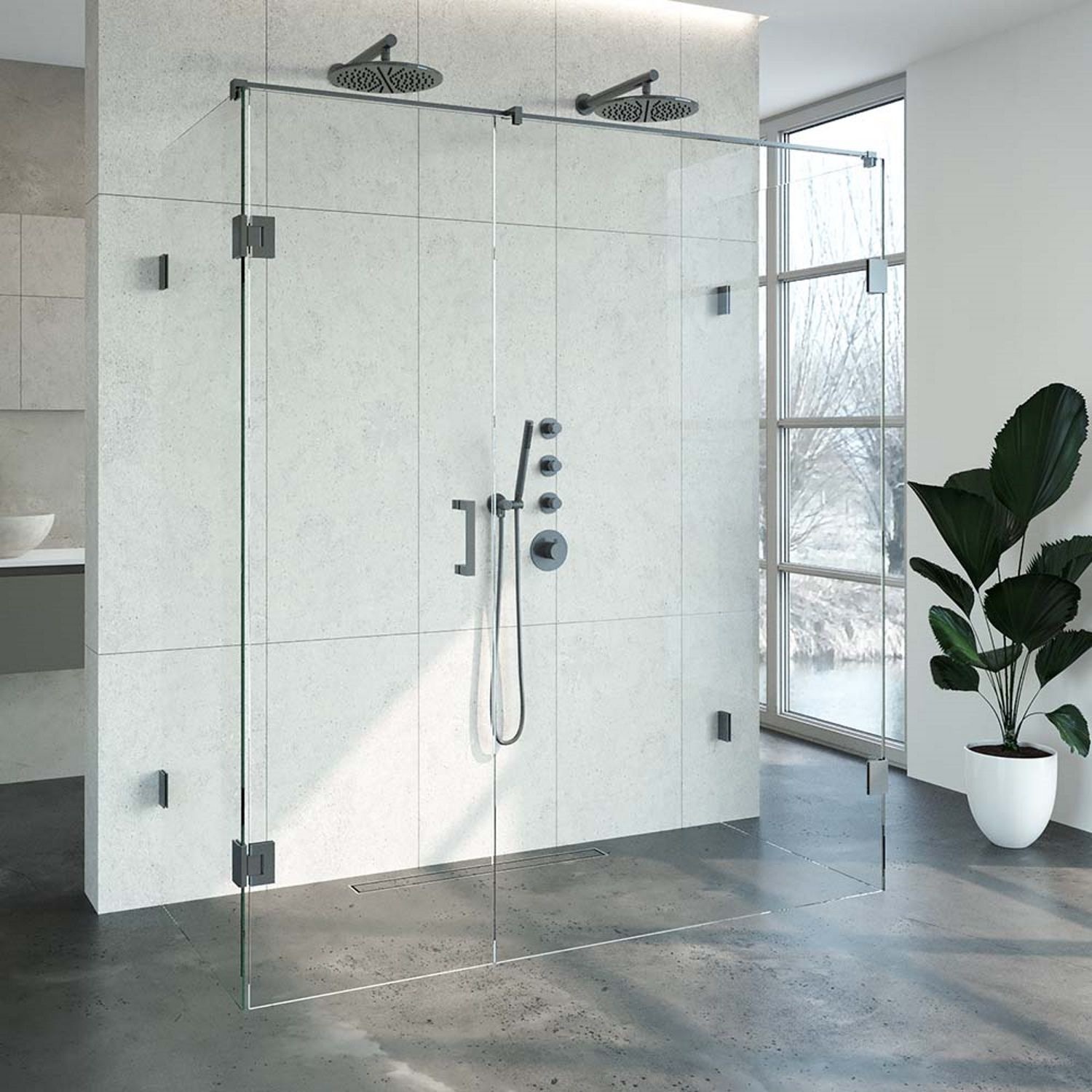 Deze complete douchecabine bestaat uit twee inloopwanden gekoppeld 80 cm, één inloopwand gekoppeld 60 cm en een draaideur 60cm met Gunmetal beslag. Inclusief glasbehandeling en optionele kunststof profielen. De hoogte van de douchecabine is 200 cm. De cabine is 178,8 cm breed en 77,7 cm diep. Deze douchecabine straalt luxe uit door zijn design en kleur.