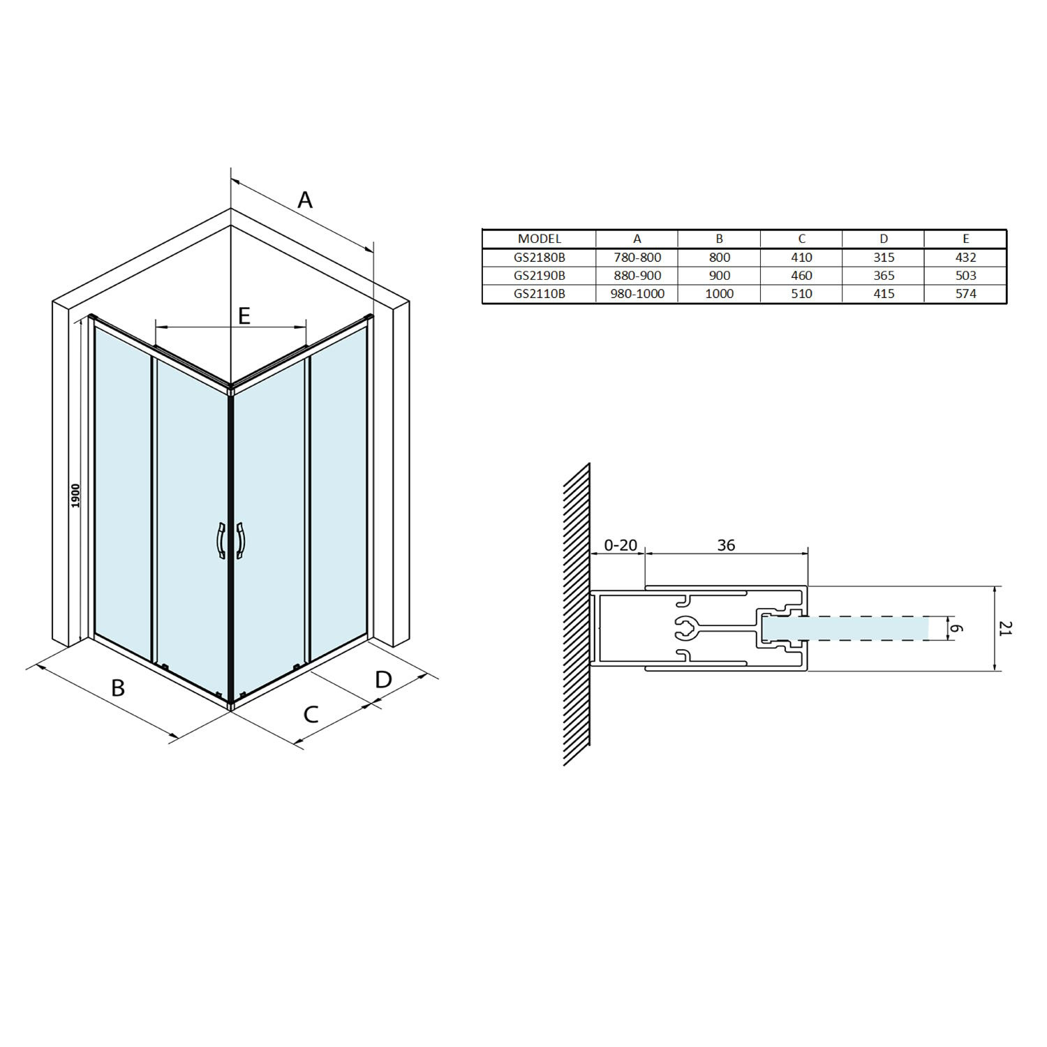 De cabine is 100 cm breed en 100 cm diep, daarnaast is deze douchecabine 190 cm hoog. De instap is 57.4 cm breed en het glas van de cabine is 6 mm dik.