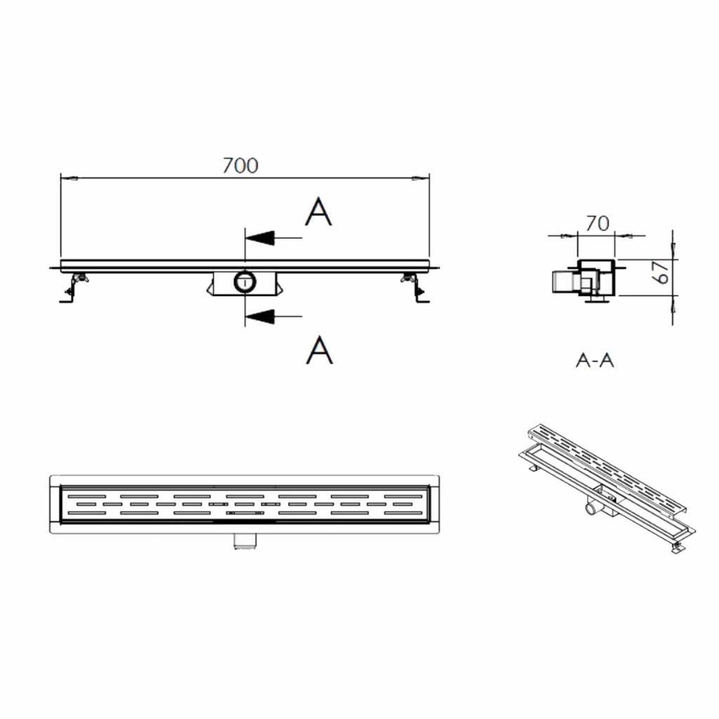 Het sifon is uitneembaar zodat u het goed kunt schoonmaken. Met het haarfilter kunt u de goot nog schoner houden en u voorkomt hiermee verstopping. De sifon is slechts 6.7cm diep (geïntegreerd). De slanke goot van 70 cm is volledig gemaakt van RVS met een mat zwarte afwerking.