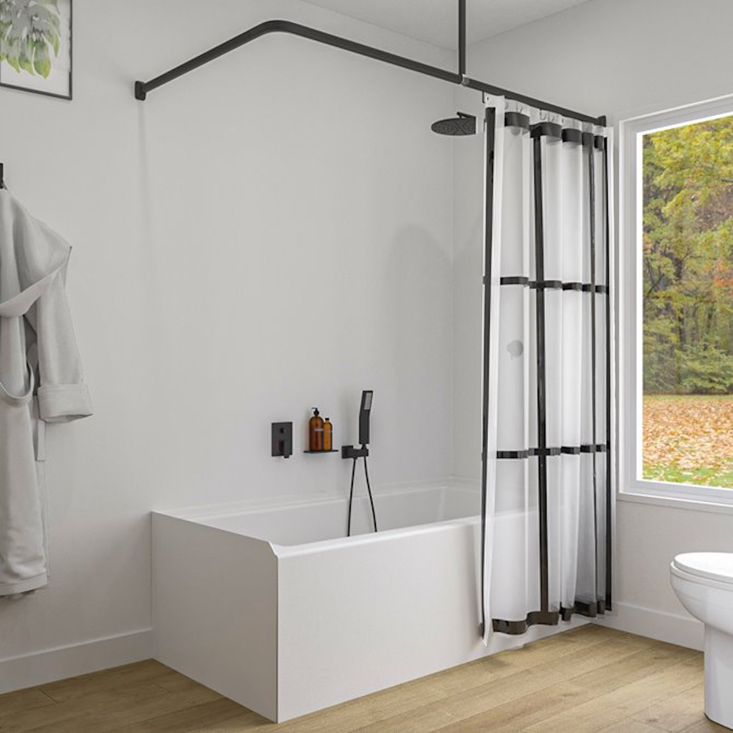 Deze set bevat 3 stangen van 90 cm, een plafondsteun van 60 cm, 2 koppelstukken en 12 gordijnhaken. De douchegordijnstangen zijn eenvoudig op maat te zagen. Het benodigde bevestigingsmateriaal en een handleiding is inbegrepen.