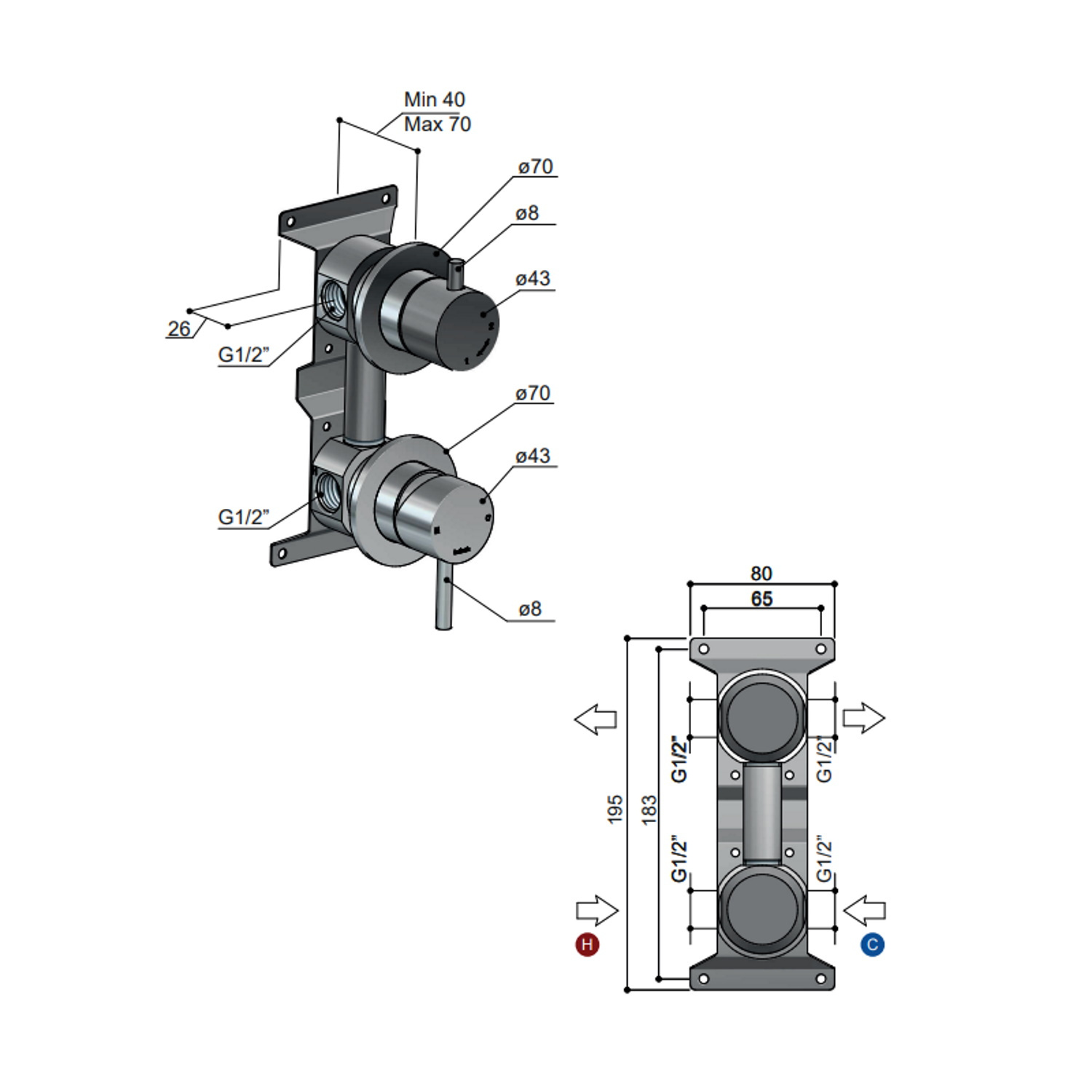 Het inbouwdeel is acht cm breed en 19.5 cm hoog. Het rozet heeft een doorsnede van zeven cm en de greep met hendel is 4.3 cm. De ruimte die qua diepte nodig is om deze kraan de plaatsen. is minimaal vier cm en maximaal zeven cm.
