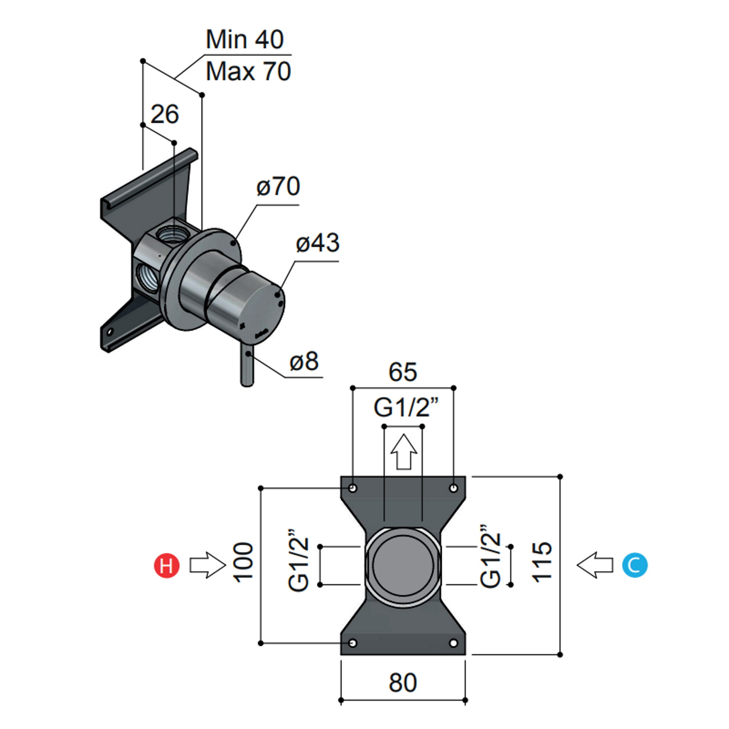 Het inbouwdeel is 8 cm breed en 15 cm hoog. Het rozet heeft een doorsnede van 7 cm en de greep met hendel is 4.3 cm. De ruimte die qua diepte nodig is om deze kraan de plaatsen. is minimaal 4 cm en maximaal 7 cm.