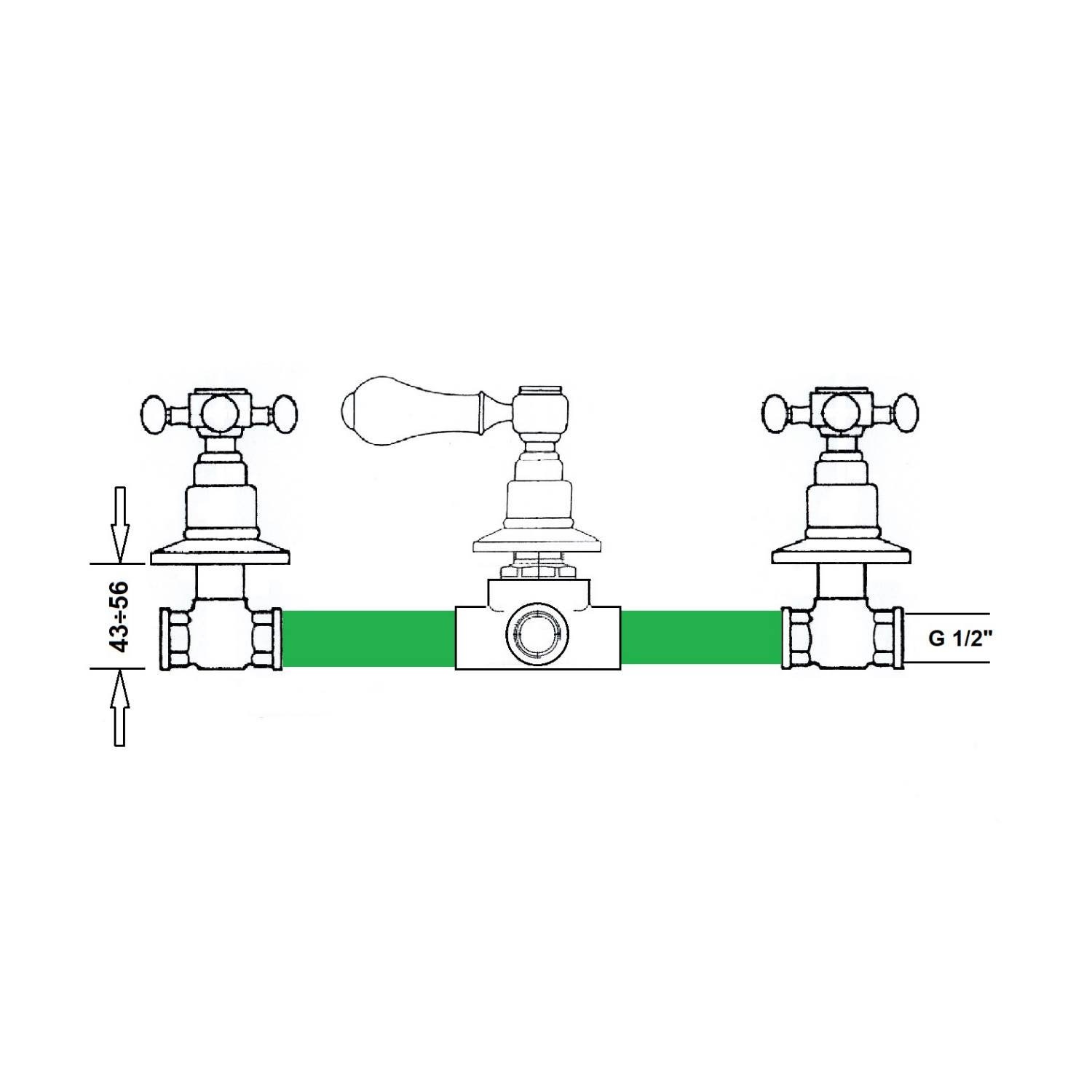 De mengkraan bestaat uit 3 bedieningen. Met de kruisgrepen bedien je de mengkraan, met de rechter bedient u het koude water en met de linker bedient u het warme water. Zo kunt u gemakkelijk de juiste temperatuur bepalen. De hendel in het midden gebruikt u om te wisselen van de handdouche naar de hoofddouche en weer terug. Deze luxe is ideaal voor als u even heerlijk wilt ontspannen. Let op! De aftappunten zijn niet gelijktijdig te gebruiken.