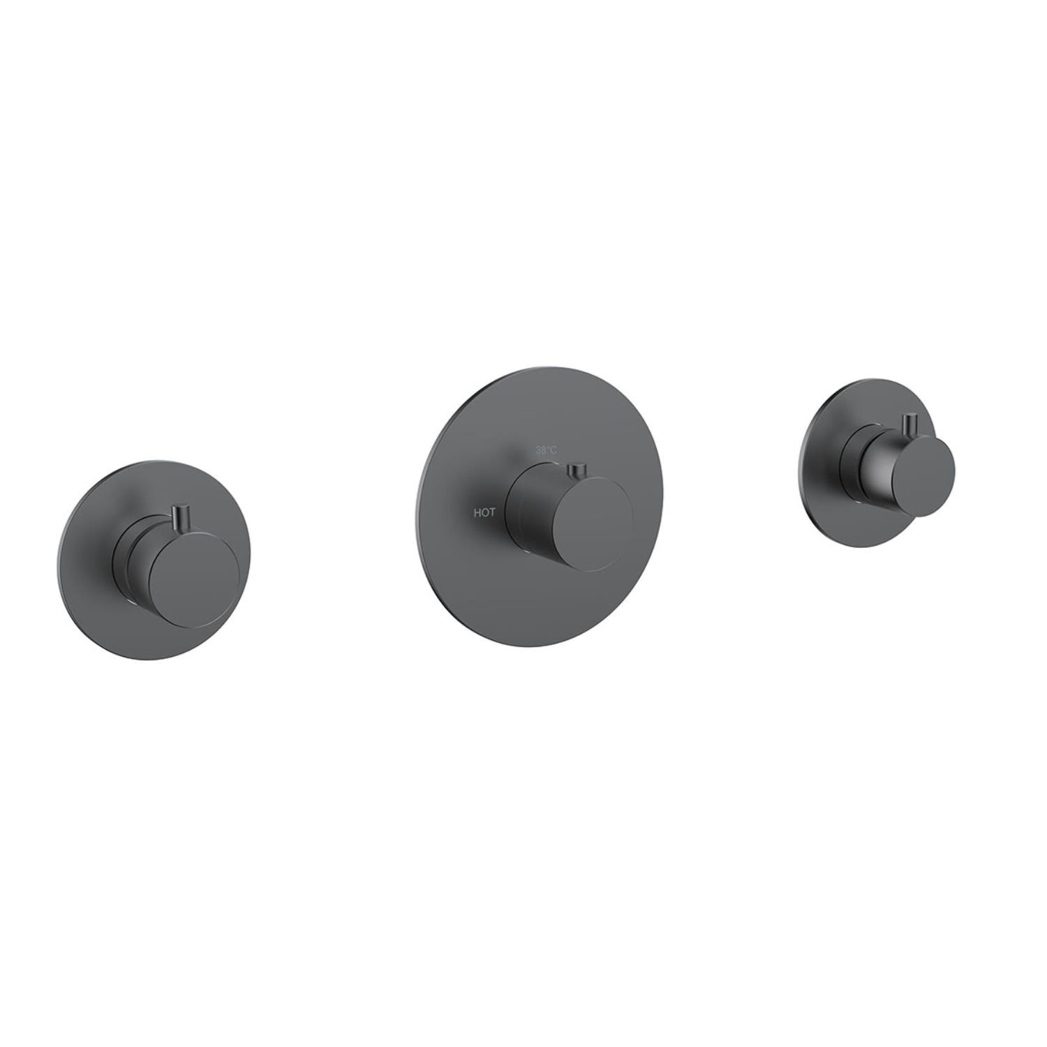 De douchekraan is gemaakt van messing en uitgevoerd in een gunmetal kleur. Het artikel bestaat uit een thermostatische kraan en twee stopkranen. Belangrijk om te weten is dat dit alleen het afbouwdeel is. Het inbouwdeel dient u apart bij te bestellen.