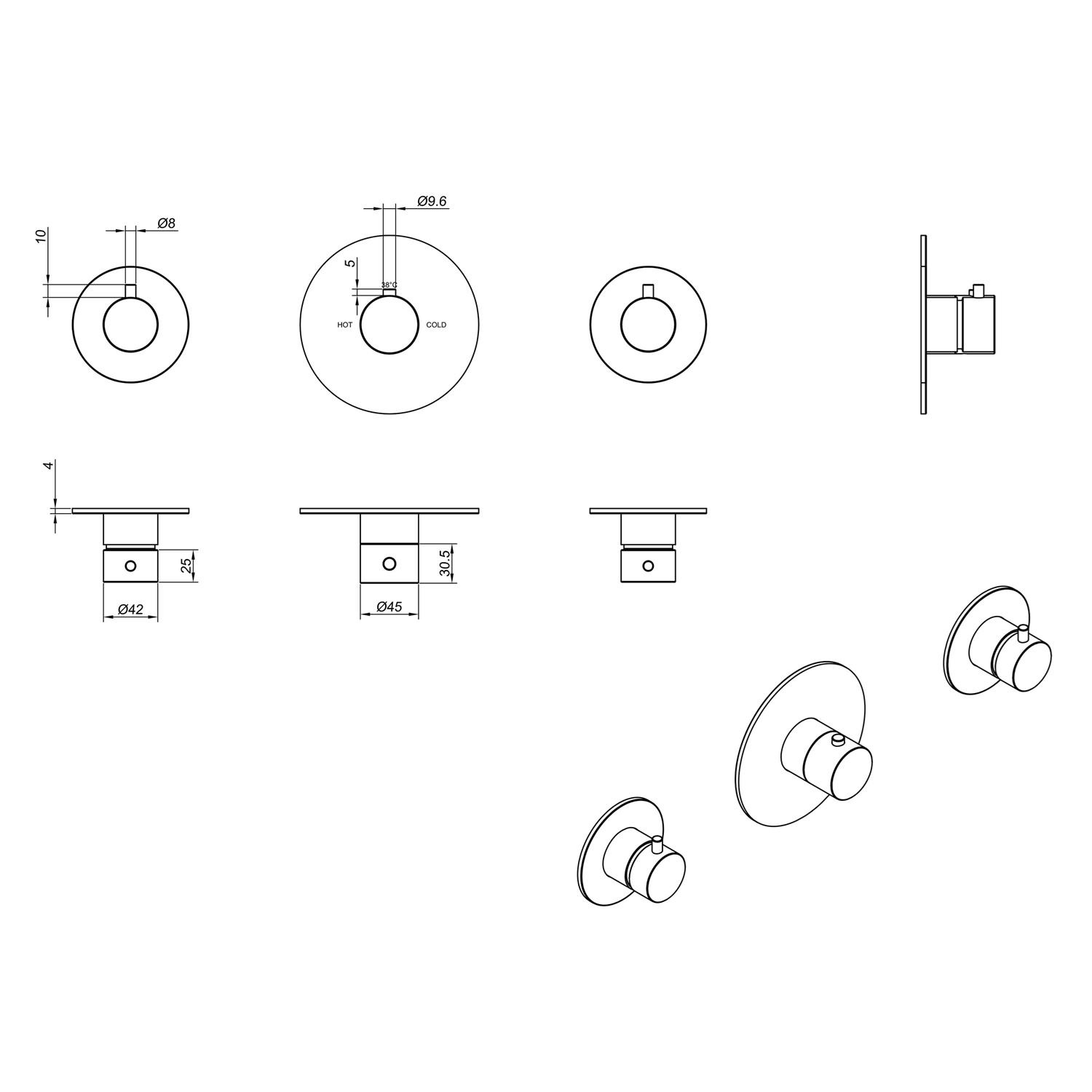 Bij deze kraan ontvangt u 2 jaar garantie. De thermostaatkraan is 13.8 cm in diameter. De stopkranen zijn 9 cm in diameter.
