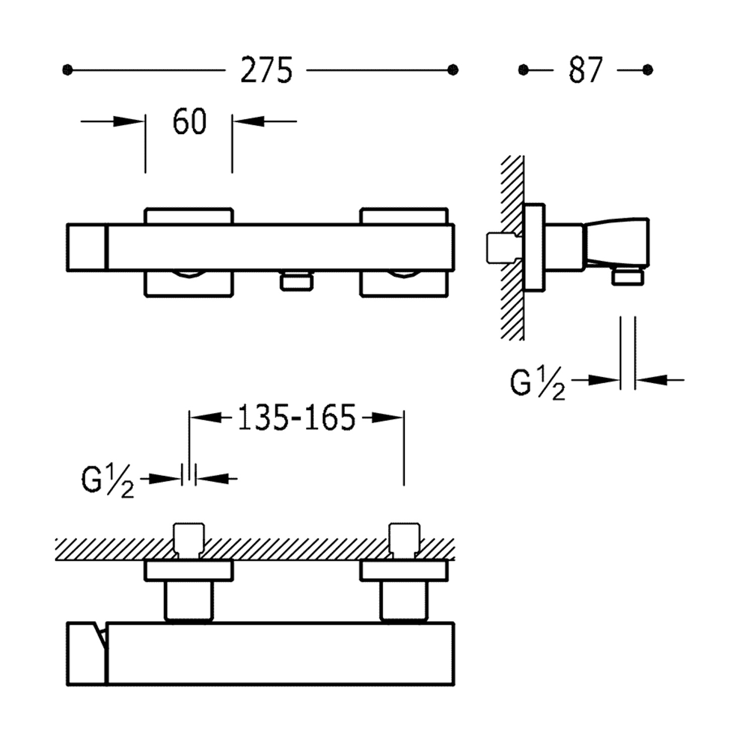 Bij deze opbouwkraan zit een handdoucheset ingebegrepen. Deze bestaat uit een handdouche, handdouchehouder en een doucheslang. De opbouw douchekraan heeft een lengte van 27,5 cm en een diepte van 8,7 cm. De H.O.H. afstand is aanpasbaar tussen 13,5 cm en 16,5 cm. De vierkante rozetten zijn 6x6 cm.