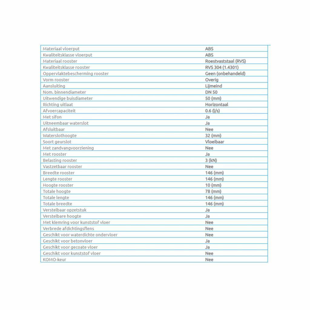 Doucheput Aquaberg ABS Vloerput ABS Opzetstuk RVS Sierrand Zijuitlaat 50mm Verstelbaar 146x146mm PPC Reukafsluiter