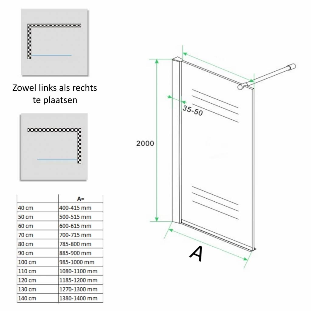 De douchewand is voorzien 8mm dik veiligheidsglas. Doordat de douchewand geen vloerbevestiging onder het vaste deel heeft, kunt u direct na het plaatsen dit deel transparant afkitten op de vloer. Ook is het mogelijk om de douchewand op een douchebak te plaatsen.